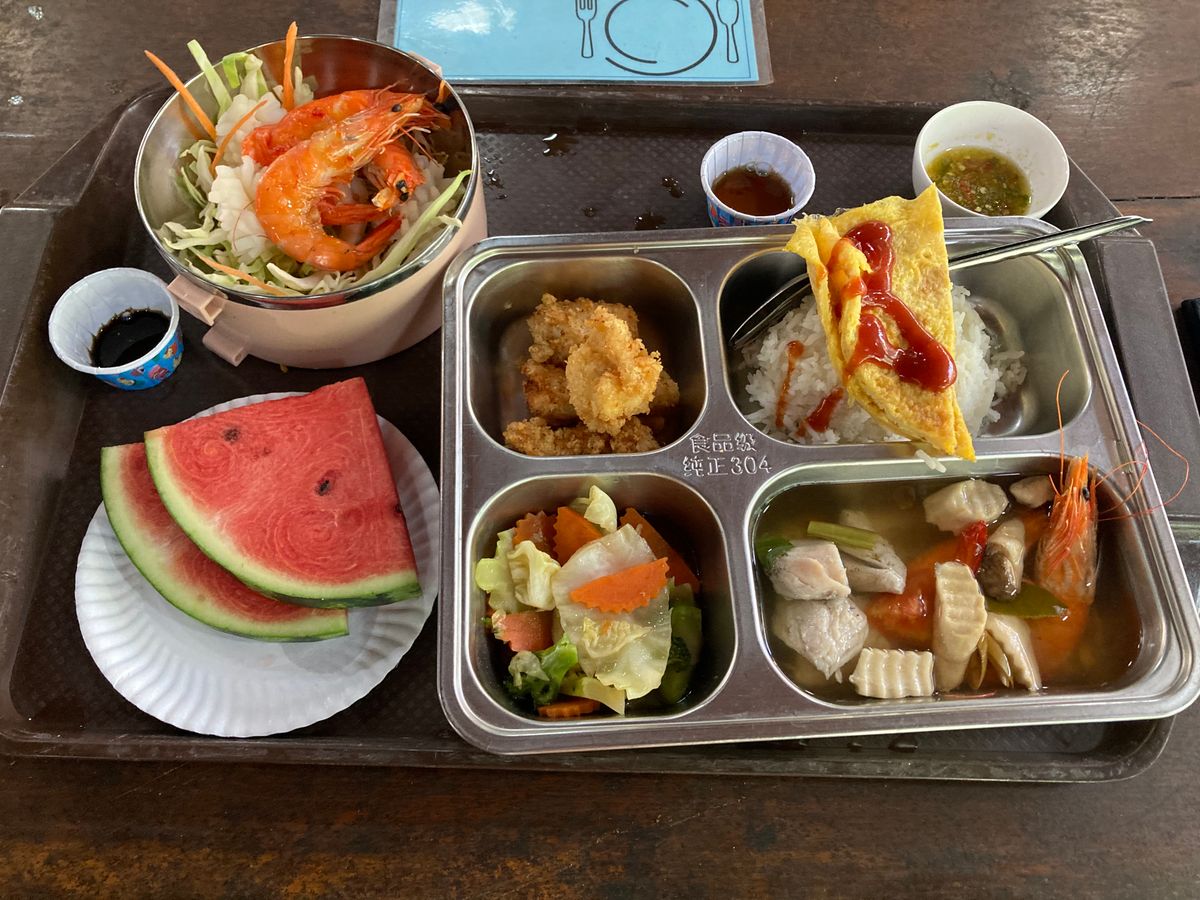 お昼はパンジー島のビュッフェをいただきました。タイ米・おかず・揚げ物・カレーが二種類ずつと、スープが一種類ありました。美味しかったです。