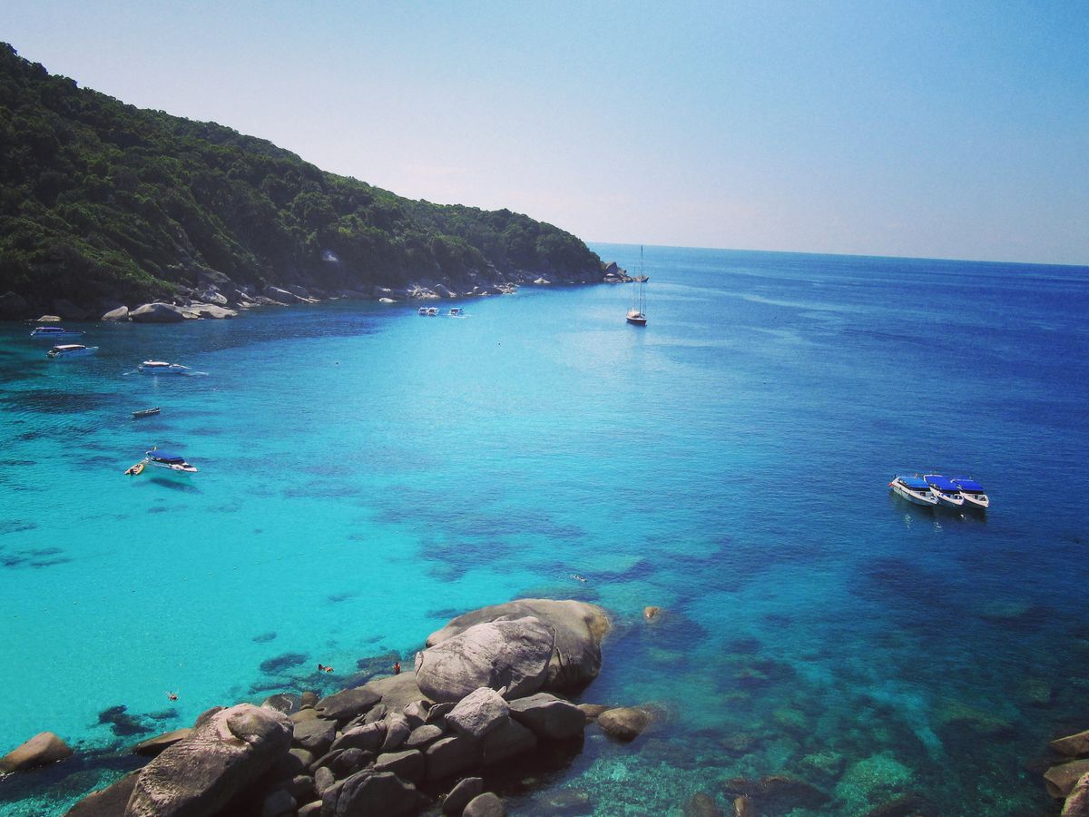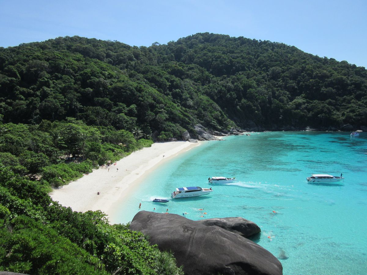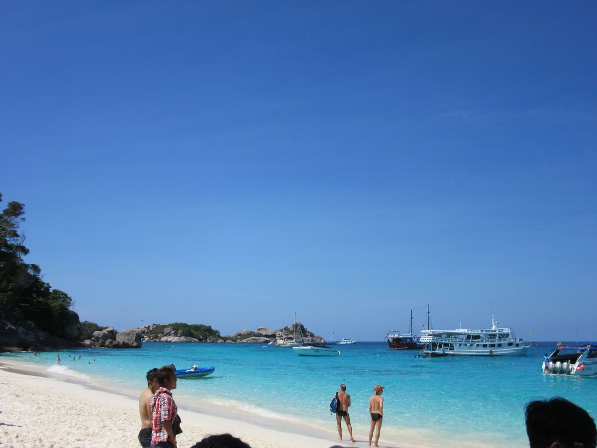 シミランは島が数個まとまってあるのですが、ひとつめの島でボートからシュノーケルで海に入った瞬間、まさに別世界でした。当方前日にコーラルや世界の海でシュノーケルをしていますが、ここがダントツでナンバーワンです。その後にビーチがある島「No.8」へ。ここの水質はもう真水なの?てくらい透明で、海に入り水面の上から足がはっきりとクリアに見えるほど。