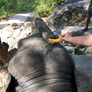 こちらの象のりは、エレファント・トレッキングタイプになり、山を登って行くタイプですのでその分スリル満点ですが、アンダマン海が見渡せる山頂は絶景ですよね♪象さんと触れ合ったり、ご家族皆様ご満足頂けたようで嬉しい限りです。またファミリー様のおっしゃるとおり、サトウキビ、バナナ(時期により異なります)など販売しておりますので、待ち時間帯にご購入してお持ちいただければ、象乗り中にエサやりが出来ます。