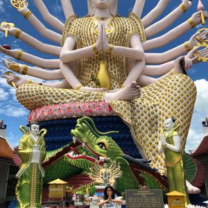 食後はまたピックアップトラックの荷台に乗って移動。Statue of the goddess Guanyinのある寺院を15分で見学。再び移動。Lad Koh View Pointで止まって、海を見る。海辺まで降りれます。そして移動。サファリパークについて、動物との記念撮影。トラ400BT、レオパード300BT。カメラは自分のを渡します。いろんなショットや動画までたくさん撮ってくれます。そして移動。射撃します?には、しませんで、射撃場を通り過ぎます。そしてNa Mueang 2 Waterfallまで車で移動。滝を見ます。子供達は水着を下に着てたので、少し水遊び。外人はジップラインを。ウォータースライダーは稼働していないみたいでした。