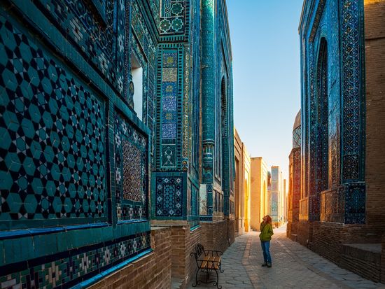 シャーヒズィンダ廟群は、サマルカンドの丘陵地に広がる神秘的な霊廟群で、「生きている王」という意味を持ちます。14~15世紀に建てられた壮麗な建築が連なるその景観は圧巻で、美しい青と緑のタイル装飾が特徴です。