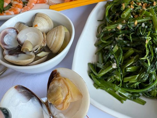 海老、蛤(みたいな)、イカ、海老炒飯、揚げ春巻きなど食べきれない昼食。どれも絶品だった!