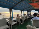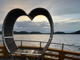 大型バスに乗り換えて、島の南部のSao Beachへ。風光明媚なビーチで、どこを撮っても絵になります。ここから小船に乗って、沖に停めてある大型船に乗り換えます。小船に乗る際に濡れる可能性があるので、履き物はサンダルが良いと思います。大型船は3階建てで、揺れが少なく快適。2階にハートの形をしたSNS映えしそうなベンチがありました。しばし船上からサンセットを楽しみます。