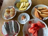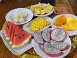 歌に歓迎されながら上品な甘さの柑橘類、ランブータン、パイナップルは塩をつけ頂き、スイカも甘く、パパイヤ、ドラゴンフルーツとお腹いっぱい。