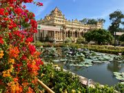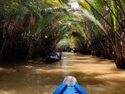 バスで先に永長寺に行きました。建物と庭園の花も素晴らしく、ベトナム内を回った中で最も記憶に残る寺の一つでした。 港から島まで、貨物船も航行する濁流の川を進みます。島に上陸したら、エンジン船と手こき船で密林川を進みます。昼食と絡めて果物産地の見学などもあり、熱帯の自然や暮らしがよくわかる、よく出来たツアーだと思います。 島内で港に戻る際にノスタルジックな車に乗車することや、希望者がワニの餌やりやヘビ
