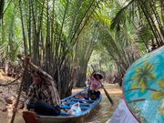 ホーチミンの街もよいけど田舎のほうも体験しようと参加。ホテル近くでピックアップしてもらい、バスに乗ると16名参加。みなさん日本の方なのですぐ仲良くなれます。1時間半くらいでメコン川に。船で中洲の島へ渡り、ハチミツ農場でハチミツとココナッツのお茶を出してくれました。島内を中型電動カートで散策、そのあと歌を聞きながら果物をいただき、大きな蛇を抱っこして(されて?)、その後ボートでジャングルクルーズ。島