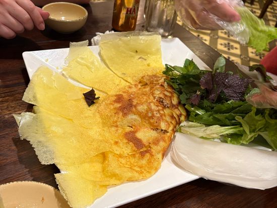 予約必須。自分で予約出来ないのでこちらもお願いして良かったです!早く着いたので「早めに入れないか」と交渉したが、とにかくお客さんが多くムリでした。お腹がいっぱいだったので名物のバインセオを頼みました。本当に大きくてビックリ!マンゴージュース... 続きを読む