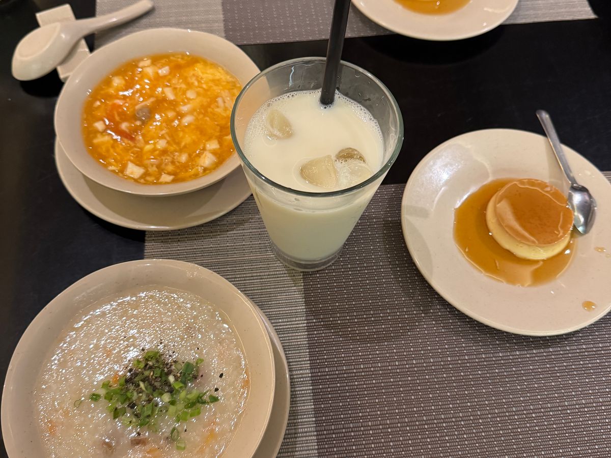 食事はエビ、カニ、野菜炒め、ごはん、デザートです。