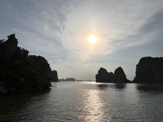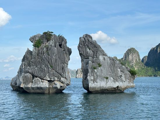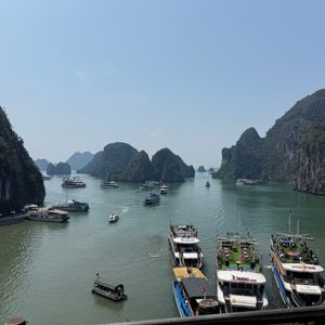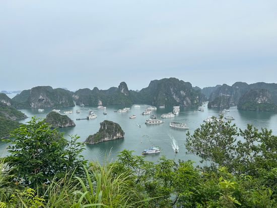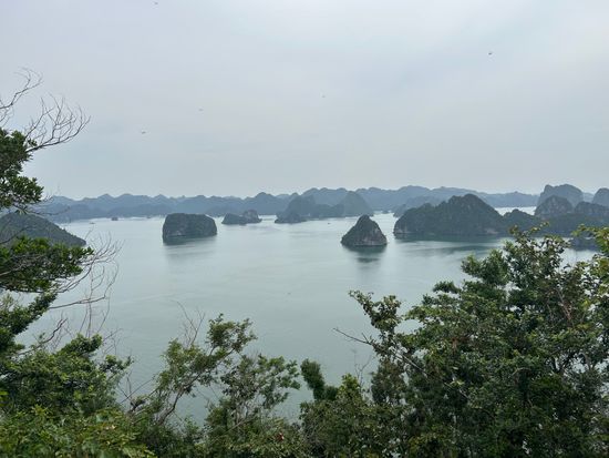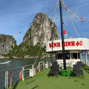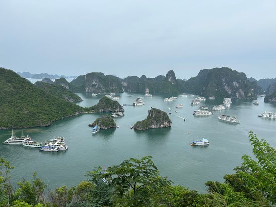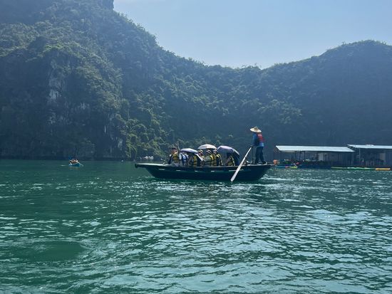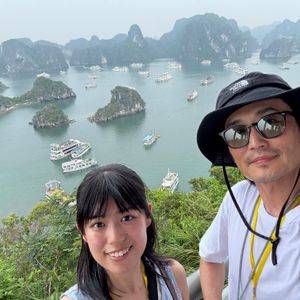 ハロン湾について日本人専用観光船 Fuji に乗りまずはランチ。相席ですがもう1組もお父さんと娘さんのコンビで居心地は良かったです。ランチの味もボリュームも満足。食後は元水上生活をしていたエリアでバンブーボート体験。Fujiに乗ってスンソット洞窟に移動して内部を探検。最後にティートップ島に行って山登り。気温がとても高い日だったので、特にティートップ島の900段の階段では全身から汗が吹き出すほどでしたが、船に戻ると冷たいタオルを用意してくださっていたので助かりました。また、とても手頃なお値段で水やビールを購入することができるので、こちらも助かりました。