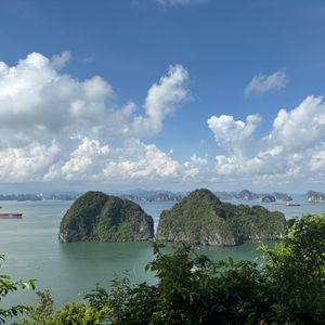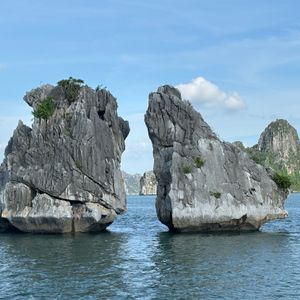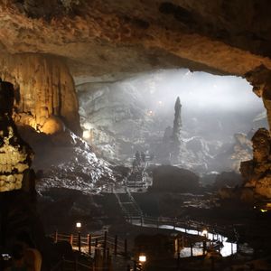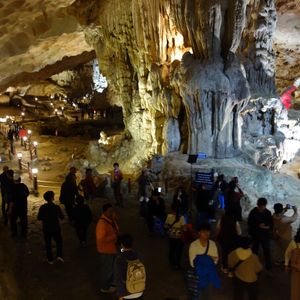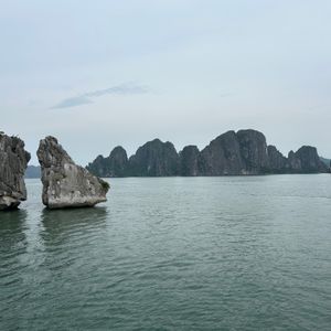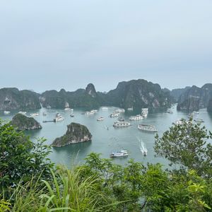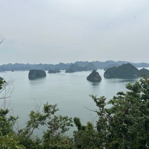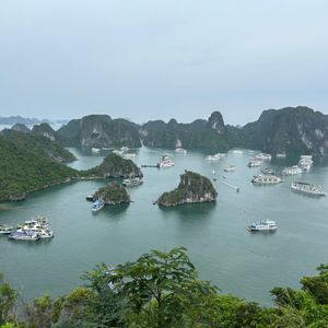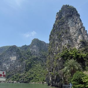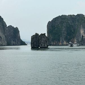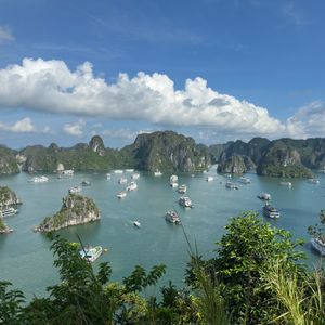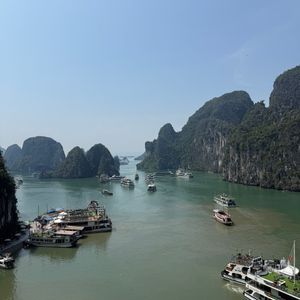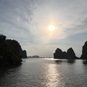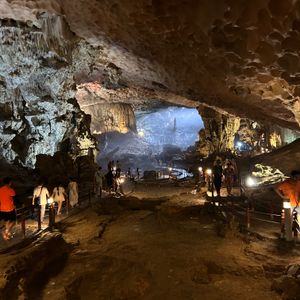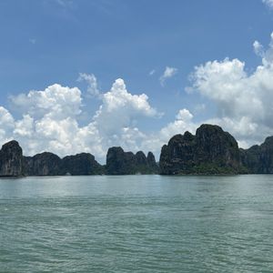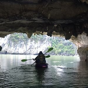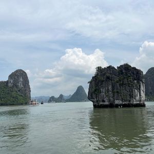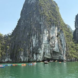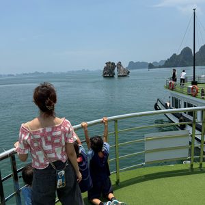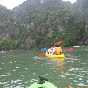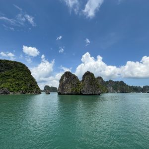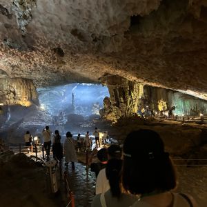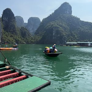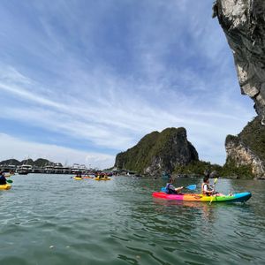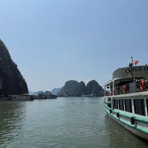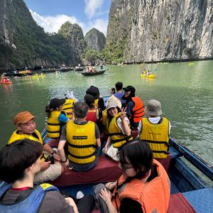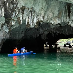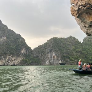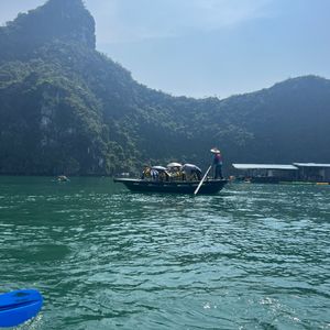 明るく面白いベトナム人ガイドさんが日本語で案内してくれました。行きのバスでベトナムのことやおすすめ観光地など教えてもらえました。ハロン湾に着くと早速船内で食事の時間となります。飲み物は別料金で帰りに支払います。6人で相席、食事は大皿で出てくるスタイルです。種類・量が多く食べきれませんでした。(味はそこそこ、クセも少なく食べやすいです。)1時間くらいして岸に着くと手漕ぎ船かカヤックを選択でき、私は船に乗りました。間近で見る景色はとても綺麗でした!残念ながら途中で雨が降ってきてしまいましたが、乗ることができ良かったです。雨が少し落ち着いた後に希望する人のみで鍾乳洞に行きました。自然に作られたとは思えないほど美しく、神秘的で感動しました。足元の悪い中案内してくれたガイドさんに感謝です!帰りに食べたブンチャー(ベトナムの素麺みたいな料理)がとても美味しくてまた食べたいです。