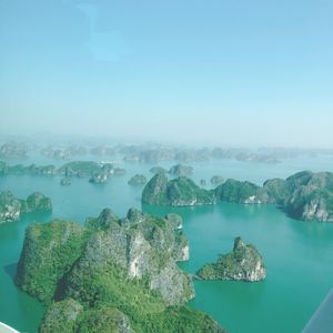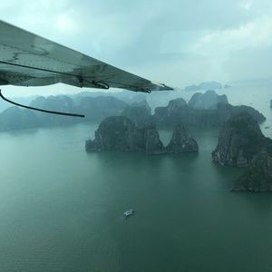 10月中旬、ハノイ深夜到着便利用での4泊5日の日程旅行の2日目に、海外旅行はエアーもホテルも全て個人手配、オプショナルツアーにはあまり興味のない友人二人組で『セスナ遊覧』の言葉に惹かれてこちらのツアーに参加しました。ハロン湾へは二度目となり以前は沖合に停泊した客船から眺めるだけだったので今回『空と陸』の両方から世界遺産を隈なく観光できた事は文字通りの『メモリアル&プライスレス』な旅の思い出となりました。予約申込みはハノイ到着一週間前に。専用手配につき個人都合や天候等によるツアー不成立時のキャンセルポリシーなどもしっかり明示されいて、また出発直前にホテルお迎え時間が変更となりましたがメールでのご連絡も相互確認の対応も大変早くツアー参加について不安になる事は全くありませんでした。ツアー当日は親切丁寧な日本語堪能なガイドさんと穏やかな運転手さんと私達二人の四人で半日近くをご一緒しましたが、往復5〜6時間の車内では観光地案内だけでなくベトナムの文化や生活等についても楽しく会話しながらのドライブとなりました。また終始ガイドさんから話しかけられっぱなしやガイドさんと運転手さんの二人だけでの会話等も一切なく、移動中ずっと私達に気を配ってくださっている事がとても嬉しく感じました。往路におトイレ休憩を兼ねてお土産屋さんへの立ち寄りがありましたが施設は綺麗でおトイレも衛生的。また国営との事もあってか強引な営業はありませんでした(販売されているお品物は街中価格よりは高めですが品質はしっかりしています)。正午前にハロン湾到着後、セスナ運行会社のオフィスにてパスポート提示でチェックイン。搭乗者は日本人は私達二人と他に欧米からのご年配客7〜8名。さほど待たされずにセスナ発着所(カート移動で数分)に着くとキャプテン自らお出迎えくださり自己紹介と安全運行の注意を(全て英語)。機内搭乗前には各々キャプテン(日本通の親日家さんです)とのツーショット写真を撮られていたりと雰囲気的には遊園地のアトラクションの様な。セスナはマリーナから浸水して海上から離陸。プロペロ機で小さな揺れはありましたが高度も低めで乗り物酔いや事故の不安は全くといっていいほど無く機内から動画や写真を撮りながら乗客同士その景色の素晴らしさについて語りあったりできるフレンドリーな雰囲気に『あぁ〜海外に来てるなぁ』を更に実感する事が出来ました。当日は汗ばむ事もなく風が丁度心地よい過ごしやすい日でしたが、お天気は生憎の若干曇り気味。よく目にするエメラルドグリーンの海面とはいきませんでしたが上空から見た海は緑と青のグラデーションで突き出た岩々も立体的に見え、その後に船上から見る景色とはまた違った趣があり空と陸両方ダブル観光は今回初ハロン湾の友人の『一生に一度だから』の選択は正しかったと二人して納得し贅沢過ぎる20分強のフライトを満喫しました。セスナから降りるとそこから先は他のツアー会社さんでもお取り扱いしているハロン湾船上観光コースの方々と合流となり、日本人観光客だけが乗り合わせている観光船に乗り込み出発早々に海鮮メインのベトナムカジュアルコースランチがスタート(ドリンクは別料金)。正直、船内食にはあまり期待していなかっただけに見た目かなりシンプルながら素材そのものの美味しさと品数の多さには大変満足出来るものでした。クルーズ中はガイドさんがそれぞれの代表的な岩についてクイズ等も交えながらご案内がありました。帰港前に一度下船しての鍾乳洞見学がツアーの最後に組み込まれていました。多少の階段の上り下りはありますが足を運んでまでに値する自然が作り出した幻想的な風景を目にする事が出来ました。ハロン湾を後にしてホテルまでの帰りの道中は、ツアーの疲れ等も考慮してくださりおトイレ休憩の立ち寄りの有無やホテル送りのついでに途中他に立ち寄り希望箇所等も聞いてくださり臨機応変にご対応いただける印象を受けました。限られたハノイ滞在の中で半日以上(実質朝出発の夜帰りの丸々一日)の時間が必要となるツアーにはなりますが、他国にある世界遺産巡りと比べても十分過ぎる位に価値あるものであったという感想を持てたツアーでした。機会があってまたハノイに旅する事があれば、次回はベストシーズンを選んで船内宿泊のあるプランでまたツアーに参加したいと思っています。*唯一マイナスポイントをあげるとすると、観光船の中でベトナム雑貨販売があり販売員の方が各テーブルを回られるのですが、決して強引な営業ではないのですが船の上というある種逃げ場のない状況の中で一度お断りをしても品物を変えてまたテーブルを回られるの繰り返しとなりデッキに逃げていかれる乗船客の方も見受けられました。