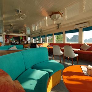 トイレはひとつしかなかったが、広くて綺麗でした。出航とともに次々に海鮮料理が出てきました。テーブルあたり4-5人で大皿を取り合う形。食べるのにいそがしくなるとハロン湾の奇岩を見落としてしまうので注意。料理は、種類も多く、野菜もふんだんにあり気に入りました。