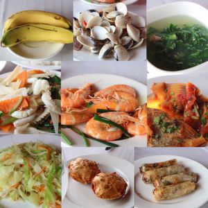 乗船後すぐに始まるシーフードランチをいただきながらのハロン湾クルーズ。ひとテーブル4人程で纏まり相席です。シーフードも味にくせがなく、揚げ春巻きが美味しかったです。ボリュームが足らない場合別売りで牡蠣やハマグリも頼めます。