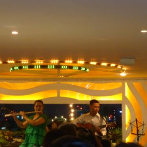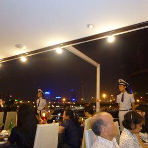 その後のサイゴン川ディナークルーズは船上で涼しく、食事が終わった頃に出航し、ホーチミンの美しい夜景が楽しめます。参加当日はフルートとクラシックギターの趣味の良い生演奏もありました。料理は期待したほどではありませんでした…。