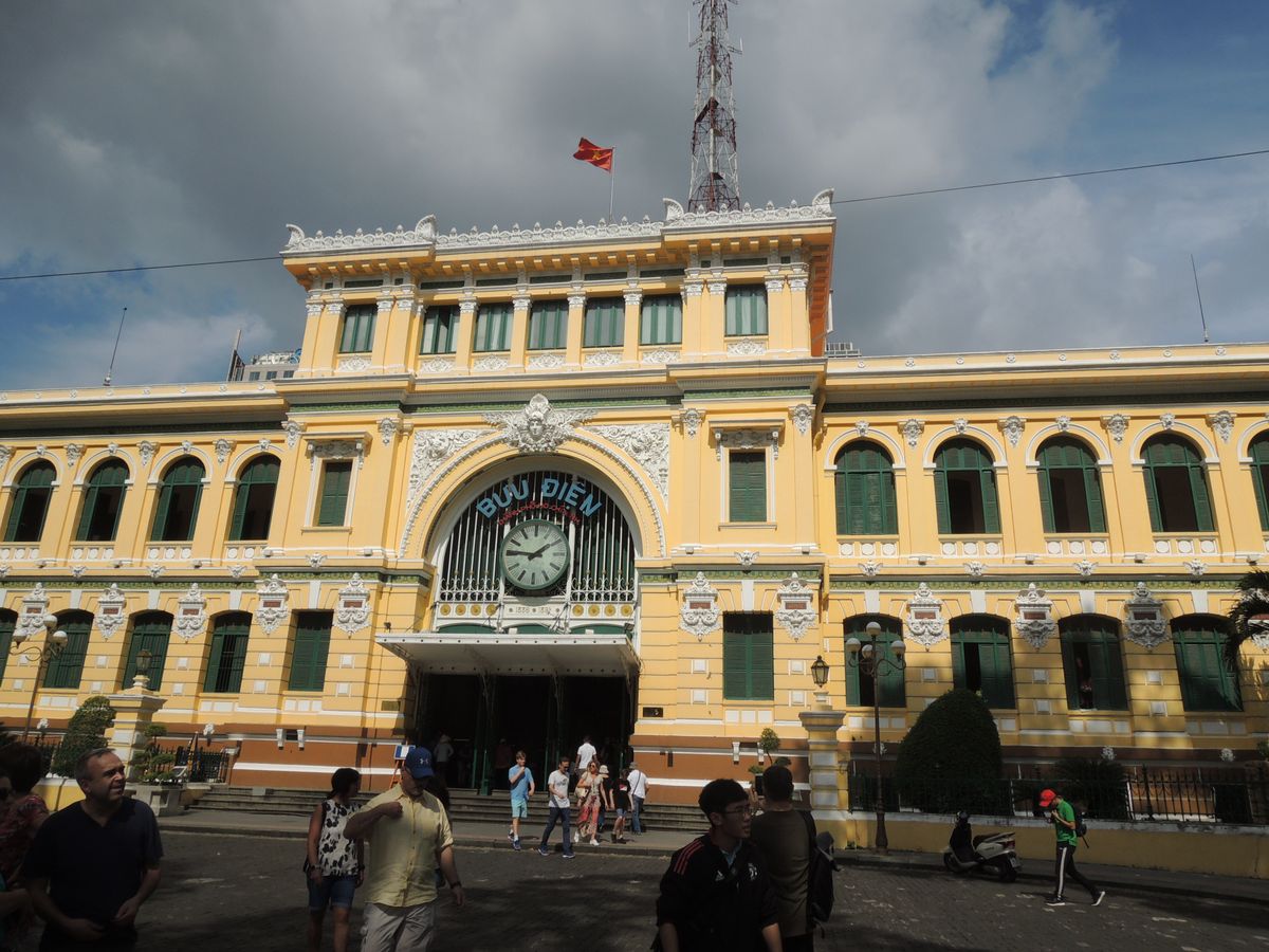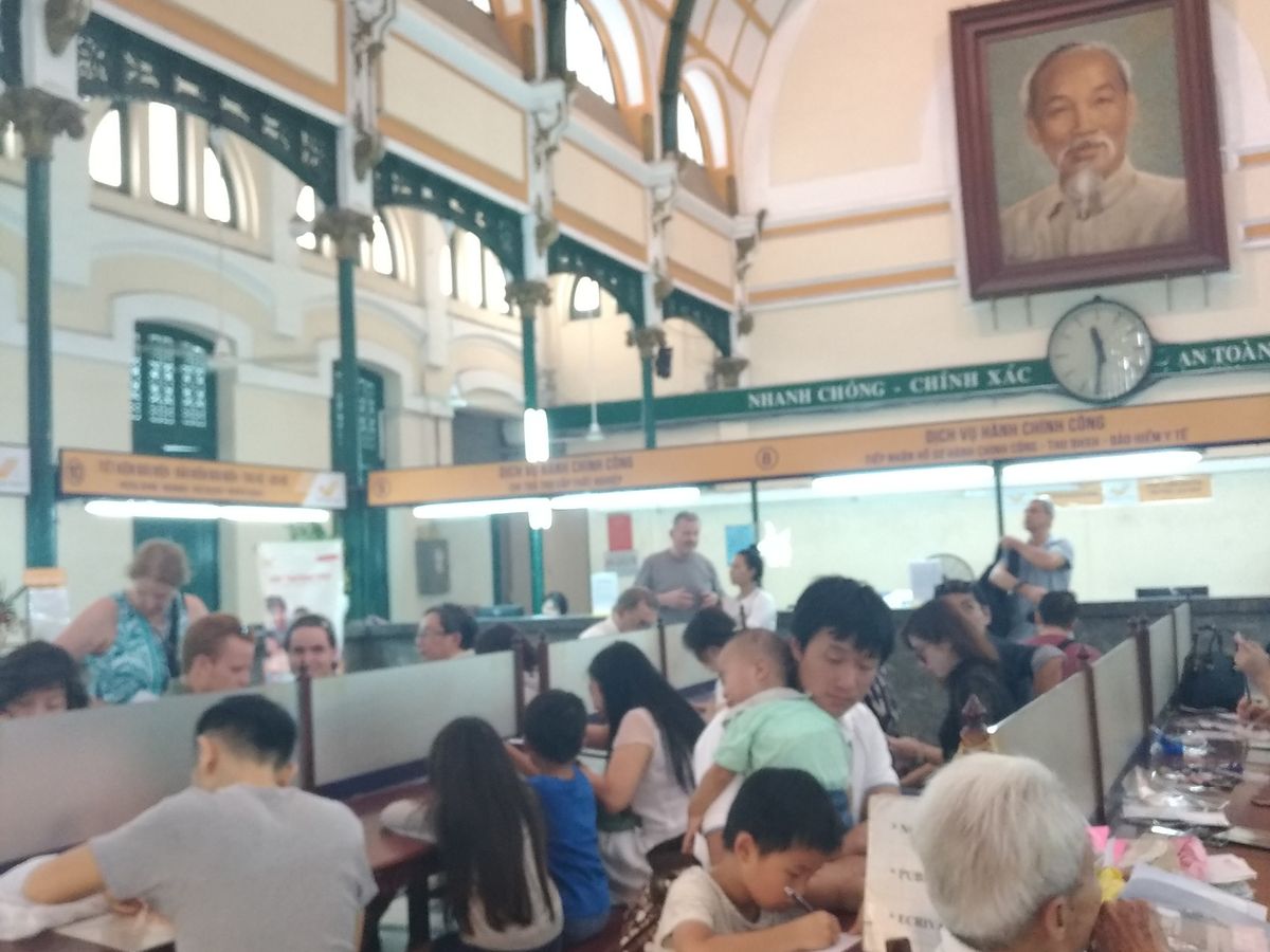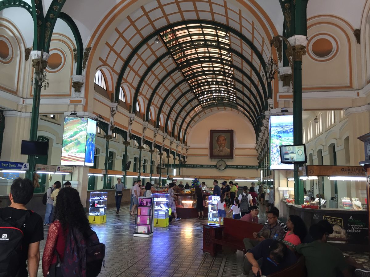ホテルに朝時間通りに迎えに来てもらい出発。統一会堂では各部屋の説明を詳しくしていただきベトナムの歴史を改めて勉強。聖母マリア教会は現在修復工事中なので中には入れませんでしたが造りが素晴らしく、修復にはフランスから赤レンガを輸入しているとのことに驚き。そうそう、教会の前の聖母マリア像の足元は必見。何かがいますよ。中央郵便局は入り口から見た正面奥のホー・チ・ミンの肖像画が何とも言えないインパクト。たくさんの観光客で郵便局でなく市場みたいに錯覚するくらい。時間があればお土産品を見たかったかな。ショッキングピンク?のタンディン協会はインスタ映えするね。最後にベンタン市場に行ったけれど、欲しいものが決まっていれば品数が豊富なのでいいかも。値段は交渉次第とのこと。