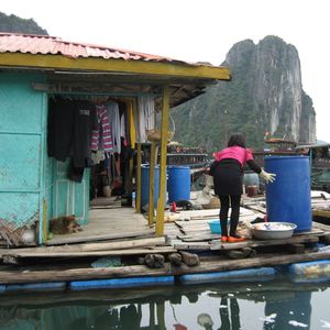 天候を心配しつつも当日は雲ひとつない晴天(#^.^#)に気分もルンルン♫ が・・・マイクロバスの席の感覚が異常に狭く凸凹道の振動で膝がゴンゴン当たりT_T 日本語ガイドツアーと英語ツアーの混載だったので外国人の方たちはさらに辛そうでした。片道約4時間は思ったよりも大変でしたが、色とりどりの細長いお家を車窓から眺めたり、牛や鶏、アヒルを見たりベトナムの風景を楽しめました。ハロン湾ではツアー別に席が決まっており私たちは個人旅行チームの女子ばかりに(-^〇^-) 船が動くとすぐさま食事、外の風景を見る余裕はなく(笑) 食べ終わる頃に絶景ポイントが近くまで迫っており2階のデッキで一望!!天気もよくこれは言葉にできないほど素晴らしかったです!!水上家屋に上陸しここからは手こぎボートでのオプション!もったいないな~と断ったのですが、せっかく来たんだしっと参加しました。漕ぎ手のおじさん?お祖父さん?(年齢不詳)がニコニコで可愛く、洞窟に入った先はそれはもう神秘的でした!! 是非オプション代(8ドル?16万ドン)だしてでも行く価値ありますよ!!戻ってからの鍾乳洞は、とても大きく綺麗なのですが、緑や青などライトアップされていたのが余分かなっと感じました。バスは大変でしたが是非お薦めします!
