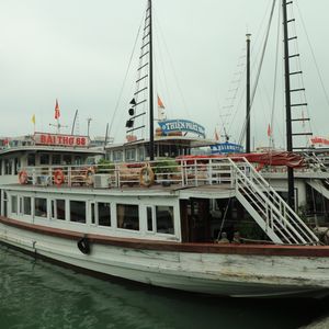 ハノイ出発は09:00頃で途中国営の土産や産でトイレタイム(国営のため安心で押し売りも無し。刺繍宇絵・宝石・アオザイ・布地・ネクタイ・菓子何でもあり)その後。一時間程で湾に到着したが悪天候のため駐車場にも入れず1時間程身動きとれず(大型観光バスでツアー客40人でした。当日はヒルトンオペラでピックアップ、メトロポールハノイ宿泊だったので至近。)。