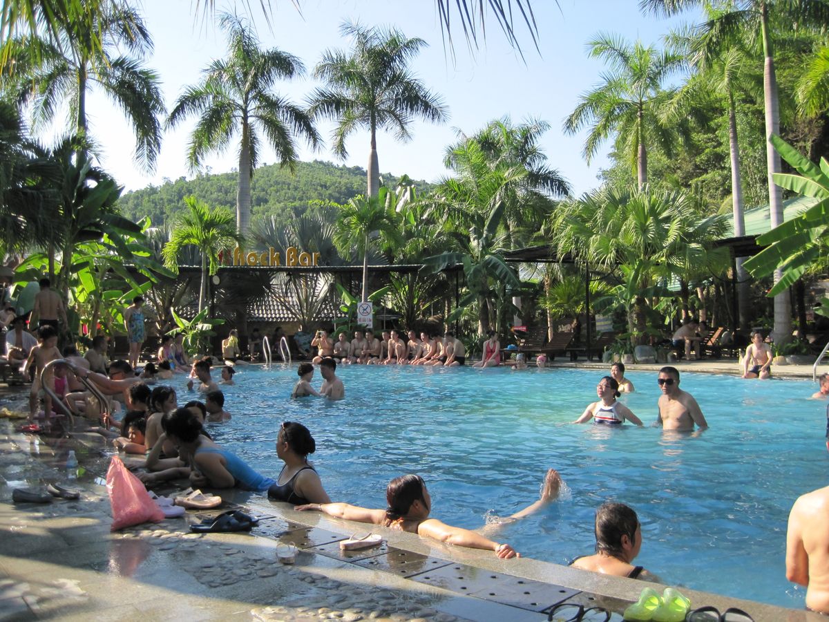昼食は食べきれない量の揚げ春巻やチャーハン、なべ料理などがありました。飲み物は別注文ですが、ビールが小瓶で1本50円という値段に驚きました。(ホテルやレストランの3分の1です)その後、スパをしてから、泥温泉という行程でした。泥温泉は、中国人の観光客が大勢いて温水プールはごったがえしていましたが、楽しかったです。