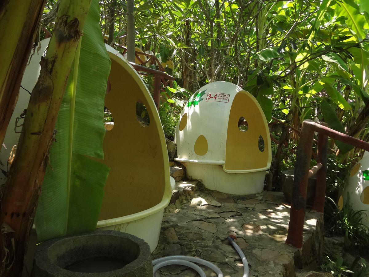 昼食はなんとベトナムテイストのマグロづくし。まぐろもローカル料理になったんでしょうね。食後、楽しみにしていた泥温泉に。郊外にある広々としたプールの奥にスパ施設が。大きな玉子の中に地下から汲み上げた泥を注入、入る時は注意、またぎますが中はすべり易いです、縁を持つことをお勧めします。20分後シャワーで流しますがこの泥が手強い、水着の縫い目までしっかり洗い流しましょう。