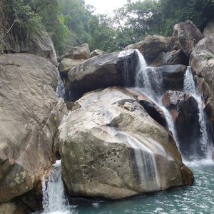 滝の入り口に着いて、地元の若者たちのグループに交じってしばらく山道を歩いていると、大きな岩だらけの場所に女性が2~3人いて、こっちと手招きするので道を教えてくれるのかと後について行くと、「えっこんなところを行くの?!」というような、川の上に渡した水道管を両手を引かれて渡ったり等のビックリ滝ツアーの始まりでした。