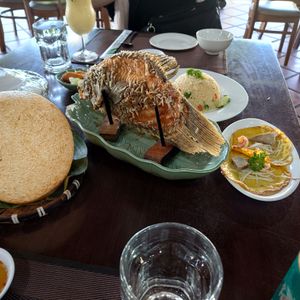名物の象耳魚は昼、夜の2回で予定されていましたが、昼は別のメニューを出してくれて夜だけ象耳魚でした。メニューがかぶらないように配慮していただきありがとうございました。象耳魚はレストランスタッフさんが取り分けて生春巻きに加工して提供してくれました。
