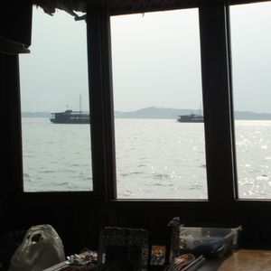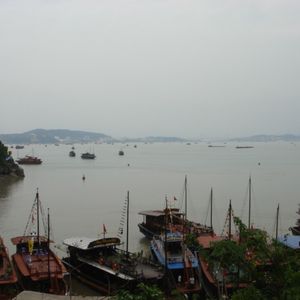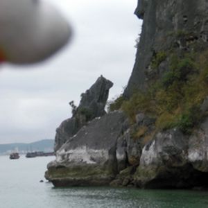 ハロン湾はこの季節は、ドンヨリと曇っていることが多いそうで、遠くの島影も薄っすらとしており、にわか一眼レフカメラマンには、少し不満がありました。海は静かで、緑に泥が混じった感じ。スクリューで、泥の道が出来ていました。寒さは冬の日本から行きましたので、甲板でも上着があれば大丈夫。その風景はすばらしく、水墨画の雰囲気十分で、他のお客さんは桂林の海版と言っていました。