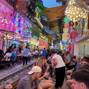 線路ギリギリに立ち並ぶカフェで、電車通過を見ることができ感動!電車通過のタイミングでカフェに行けたのはツアーならでは。シクロに乗ってバイクの合間を行くのは、とてもスリリングな体験でした。夕食も美味しく、ガイドさんの話も面白かったので大満足です!