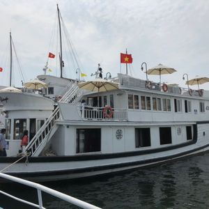 ハロン湾の船着場まで、約4時間弱はかかります。なぜならば、途中、真珠のお店に強制的に連れて行かれるからです。バスのシートは、一見、良さそうに見えますが、リクライニングする時に注意すべきです。ものすごい勢いで倒れるので、後ろの人を傷つける可能性があります。クルーズ船までは、別の船で連れていってくれます。クルーズ船のスタッフのおもてなしは、いいなぁと思っていたら、船を降りる時に、どうでしたか?サービスは、良かったですか?と聞かれ、よかったです。と答えると、じゃあ、トリップアドバイザーに、今、良かったと書いてくださいと言われました。なるほど、そういうことか。