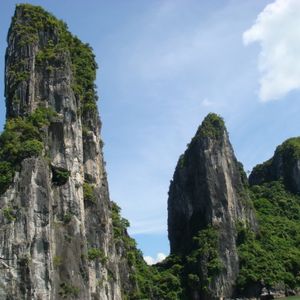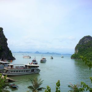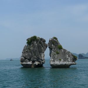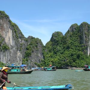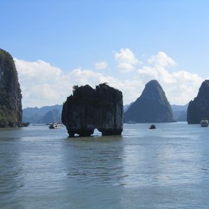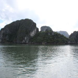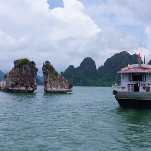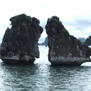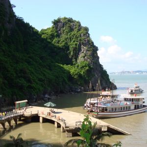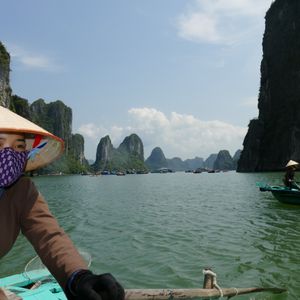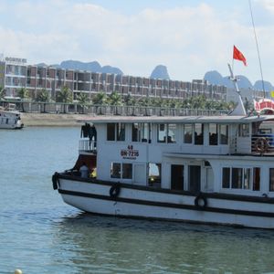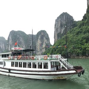 ハノイのオペラハウスで待つこと15分、少し不安になる中、電話で問い合わせしたら他の人のピックアップで少し遅れるとの事、間もなくバスが到着しました。ピックアップ対象外のホテルだとオペラハウスでのピックアップとなり、最後になるので、時間は節約できますが、バスの席はラストチョイス。私は後方座席だったので、道中の路面が悪い所でのバウンドが結構きつくて、腰が痛くなりそうでした。ガイドさんの英語は聞き取りやすく、ハロン湾に到着してから乗った船もとても綺麗に清掃されていて、お食事もお昼としては満足。ビールも1缶フリーでついていました。お食事は結構テキパキ食べないと、あっという間にハロン湾の中に入り、闘鶏岩に着きます。そこからかつては船上生活をしていた人たちがいた所へ、小船を漕いでくれたお姉さんはとってもチャーミングで、鼻歌を歌いながら漕いでくれました。鍾乳洞もとても綺麗でした。欲を言えば、もう少し鍾乳洞をゆっくり見たかったです。往復の時間がもう少し短くなれば良いのですが、こればかりはベトナムの道路がもっと整備され、交通事情が良くならないと解決はしないかもしれませんね!帰りはホアンキエム湖の湖畔で降ろしてもらったのですが、周辺の夕食スポットとかの簡単なガイドマップ等を配って頂ければ、よりよかったかも・・・私は英語がある程度出来るので良いですが、英語にまったく自信のない方は、日本語ツアーを利用された方が良いかも!逆に昼食の時に日本人で固められてしまったのは、私にとっては英語ツアーに参加しているのに、ちょっと残念な感じでした。ハロン湾に行く途中、往復一回ずつ休憩するのですが、刺繍の絵とか彫刻、宝石などが売っていました。刺繍の絵は確かにあまり他では見ないお土産かもしれませんが、お値段もそれなりなので、良く考えて買えば良いかと・・・宝石もとっても安かったので、一つ試しにエメラルド(と言っていた?確かに台はシルバーだと言っていましたが、石については明確な表現がなかったかも?)のペンダントを買ってみたのですが、やっぱりスワロフスキーでした。お値段を考えると当たり前ですけど・・・!
