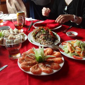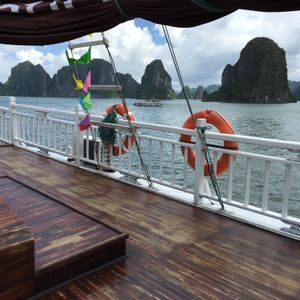 ガイドさんの説明は3・4回は繰り返しているようで。大筋は理解できたと思います。道路は一部工事中でしたが、思っていたより整備が進んでいて、快適でした。港も新しく作ったらしく、きれいで、遊覧船も、新しく快適でした。 食事もシーフードで、食べやすくておいしかったです。 そうこうしている間に、ハロン湾のきれいな景色が見えてきたので、二階のデッキに行き、写真を撮りあったりしました。