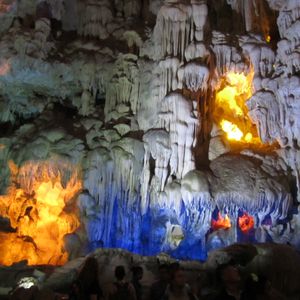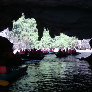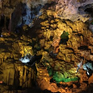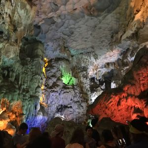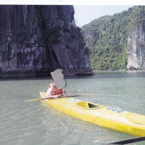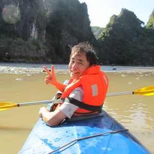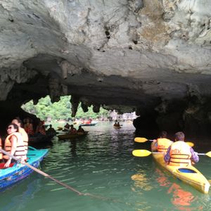鍾乳洞は、思っていたよりかなり天井が高く、大きな空間で良かったです。 さらにカヤックの区域で、初めてカヤックに挑戦しました。2人乗りなので、アメリカ人の若者の、リー氏とペアを組み、私が前で方向づけなどを担当しました。水面に近いところから見るので、遊覧船とは一味違った景色が見られたと思います。リー氏とも少し会話ができ、気持ちを合わせて協力し、初めてにしては、結構うまくカヤックを操作できたので、とても楽しかったです。リー氏も楽しめたらしく、桟橋に戻ってからがっちり握手しお互いをたたえ合いました。カヤックに乗らない方も、小舟で船頭(女性)さんのもと、波で作られた空洞など見られます。 ただ、ジーンズのふくらはぎのあたりまで、少し濡れてしまったので、バスに乗るころには、乾きましたが、気になる人は、着替えのズボンなど用意するとよいでしょう。ちなみに、リー氏は、半パンに着替えてカヤックに乗っていた。 私としては、外国の人と、簡単な英会話をしたり、少し疲れましたが、念願だったカヤックでのクルーズを、しかも、ハロン湾で体験できて最高でした。