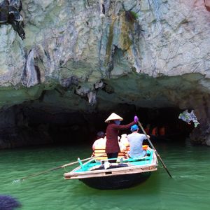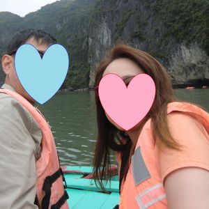 その後,自力のカヤックか,船頭さんがいるバンブーボートの選択(私たちはバンブーボートを選択)をして,湾に出ます(約40分).船頭さんが観光スポット(洞窟等)に連れて行ってくれました.言葉はベトナム語だったので,何も分かりませんでしたが,ジェスチャーで「ここで写真を撮れ(たぶん・・・)」と教えてくれたり,私たちの写真も撮ってくれました.日傘も貸してくれました.その後,鍾乳洞に行きましたが,中は階段・坂と全て徒歩なので,歩きやすい靴の方がいいです.日本の鍾乳洞のように涼しくないので,「ひんやり」を期待すると裏切られます・・・.ガイドさんが中を案内してくれて,5~6箇所に立ち止まり,解説をしてくれました.ただ,ライトアップの色はどうなんだろう・・・赤・緑とか原色揃い.その後,往きと同様30分のトイレ・お土産屋さん休憩付きの岐路につきました(トイレは帰りの方がキレイ).