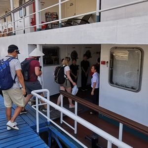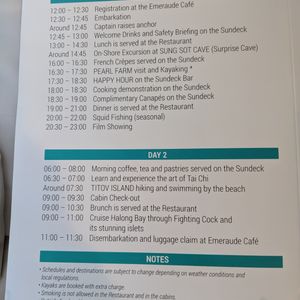 アテナ号1泊2日に参加。HPを確認の上申込み。しかし実際日程はHPと異なっていました。HPは初日「水上集落見学」、実際は「鍾乳洞見学」「海水浴」。HP2日目は「鍾乳洞見学」、実際はカヤック体験。日程変更は海外ではよくあることですが、現地スタッフ曰く「水上集落」は3年前に水質管理上の理由から立ち退いたと。以来アテナ号ではティートップ島の「海水浴」、他の船も同じだと。私たちは「海水浴」を避けるためにわざわざアテナ号を選択したのですが、HP情報の誤りにより結局とても暑い島で1時間30分無駄な時間を過しました。高齢日本人からすれば、わざわざ人口浜の狭くて汚い芋洗い状態の海水浴などしたいとは思いません。
