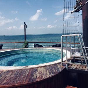 ⑤クルーズ船に戻り、湾の真ん中でクルーズ(☜クルーズ船の後部デッキより直接海に入りました。ビーチにはいきませんでした。)