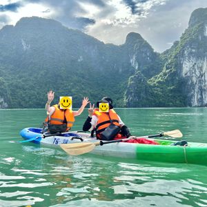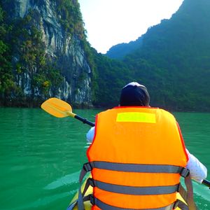 昼食をとりながら船はハロン湾へ。特徴ある景観の所で停船し一つ目のアクティビティーに。『カヤックと海水浴』だが、これは特に強制や必須ではないので季節や天候、体調を考慮して参加を決断すればいいと思う。ビーチでのんびりでもいいが海に入るならもちろん、カヤックでも水着着用の方がいい。お忘れなく。