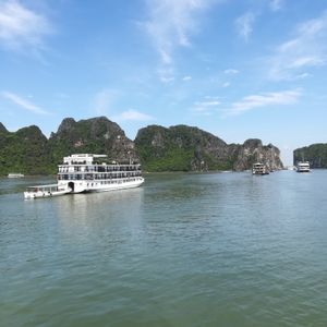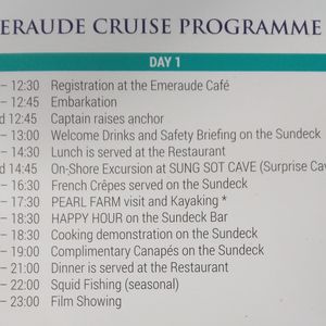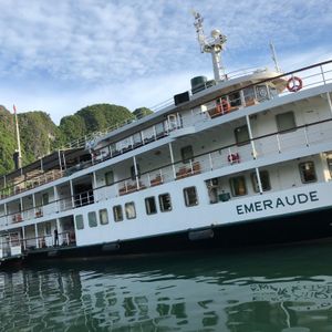 7月下旬にカップルで参加しました。行きの送迎でカタコトの日本語ガイドに「エメロード号は問題あるので他の船に変更です」とだけ告げられ、理由は分からず“Azalee号”に乗船する事となりました。エメロード号よりも小さく、食事やプランなどが少々申込プランと異なるものでした。クレープの提供が無かったり、船の豪華さがエメロード号ほどでは無かったりと残念でした。船が変更になるにしても、事前に理由と共に連絡すべきではと思います。とは言っても、一泊二日のハロン湾クルーズは総じてとても楽しかったです。船でのんびりしつつも、様々なアクティビティを楽しめました。英語ガイドツアーで日本人は私たちだけでしたが、みなさん親切で特に困ることは無かったです。