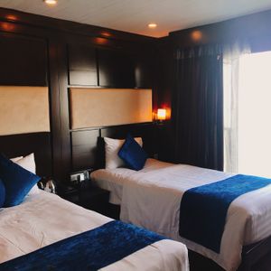 私たちの客室は2階で、ツインベッド、デスク、トイレ、シャワーとなっており、こじんまりした空間はまさに船室を感じさせます。
