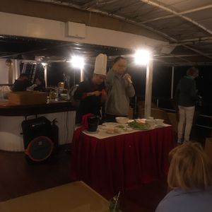 ハロン湾の美しい景色を見ながら、優雅にクルーズできるのは贅沢でした。クルーズ中には、小さな船に乗り換えて洞窟や展望台に行ったり、船内でも太極拳や生春巻づくりをしたり等、いろいろなアクティビティがあり、意外にあっという間に時間が過ぎてしまいます。それがせわしなく思う人は参加せずに船内でのんびりすることもできます。クルーズはホテルが移動しているようなもので、アクティビティ後もすぐにくつろげて疲れを感じませんでした。カヤックは追加で費用がかかりますが、個人的には自分で漕いで岩に近づいてみて自然をより近くで体感できたのは楽しかったです。ただカヤック含め、オプションのアクティビティやドリンクは観光客向け料金で、日本のそれよりちょっと安いくらいです。任意の無料アクティビティの中で真珠養殖場は観光客向けの販売がメインで特筆すべきものはありませんでした。