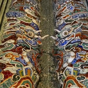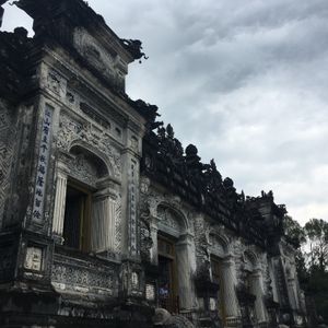 ホテルの前でpick upして頂きました。目的地には車で30分くらい着きました。参加者は私ひとりだったので、ガイドさんと2人で歩きながらフエの歴史についていろいろと説明してくださいました。国それぞれ昔話に龍が必ず出てきますが、ベトナムの龍は目が真ん丸で可愛らしい。帝廟の建物でも所々に見られます。龍の目はガラスでできていること、ガイドさんに教えていただきました。ガイドさんは地元の方で、やはりガイドさんからの説明があるからこそ、より深くフエの歴史が学べると思いました。聞いた質問にはきちんと丁寧に答えてくれるガイドさんで、ポイントポイントで「ここで写真を撮りましょうか?」と気を使って声を掛けてくださいました。最後にお土産屋さんに寄ります。ここでお茶を頂くのですが、商品を見ていたら必ず店員さんが寄ってきて商品説明が始まります。購入する意思がないことを伝えるとほっておいてくれました。