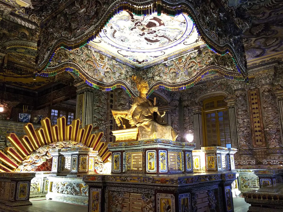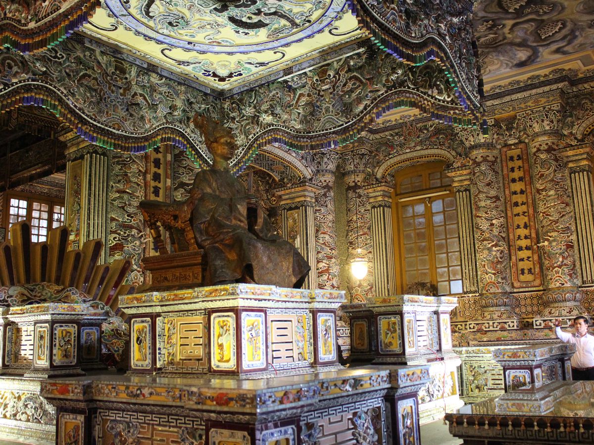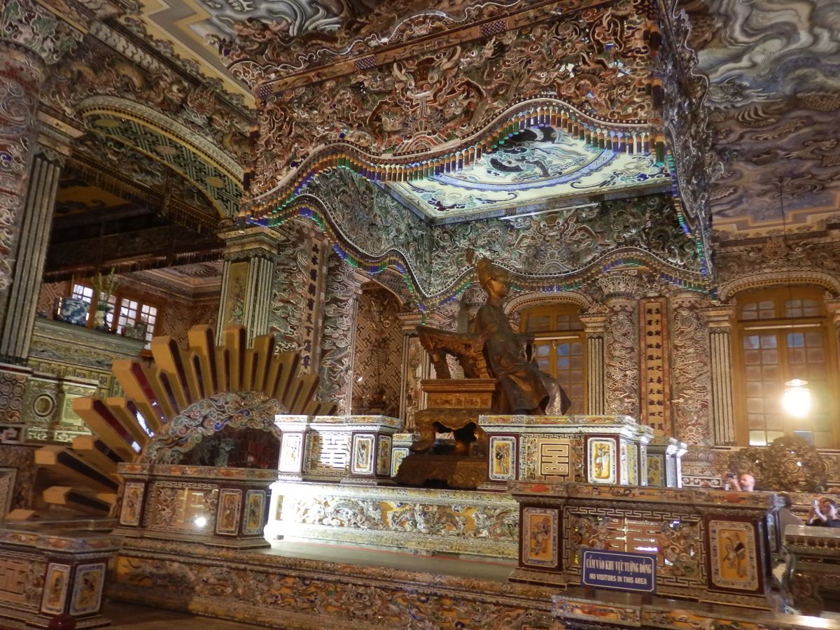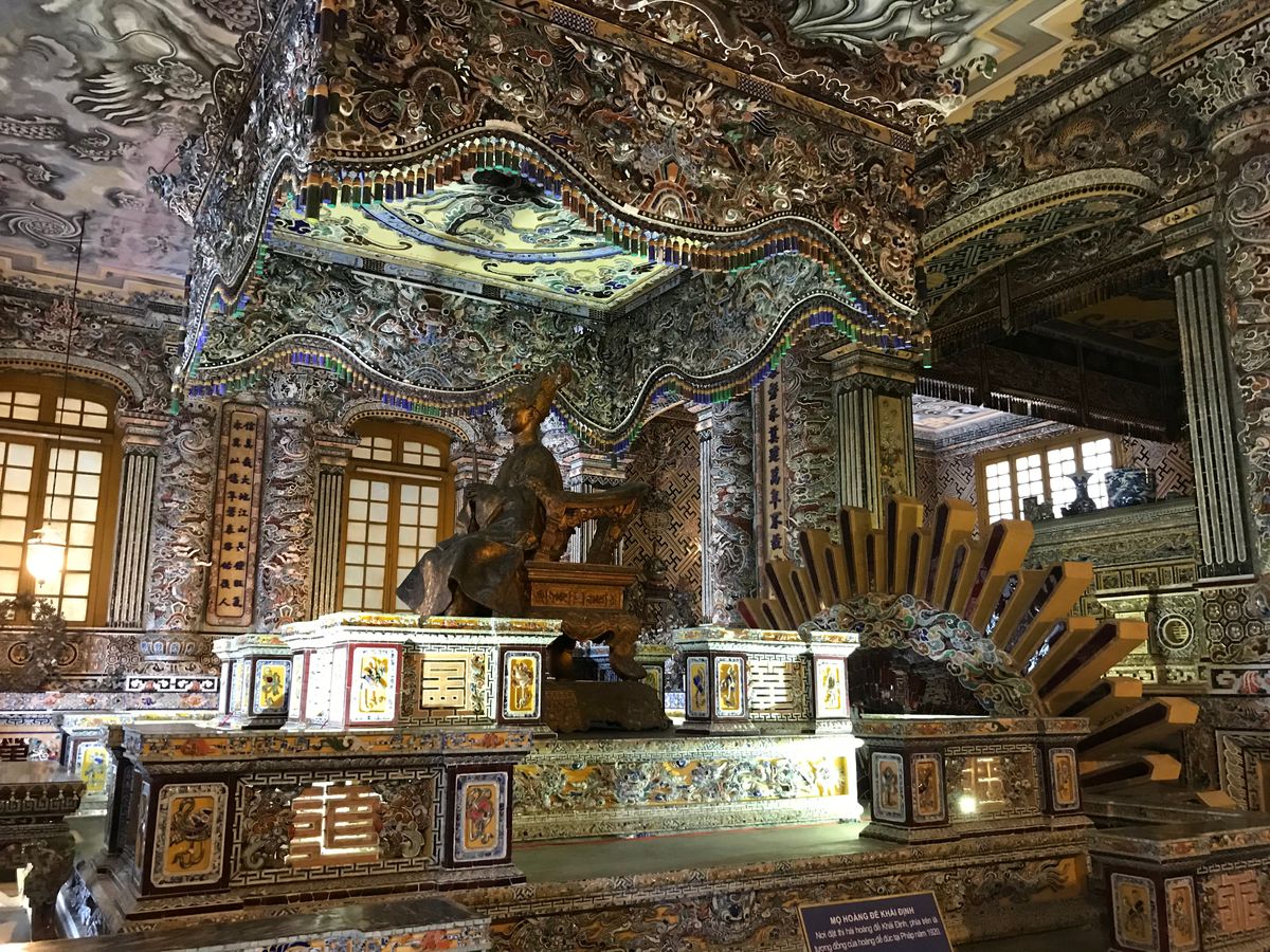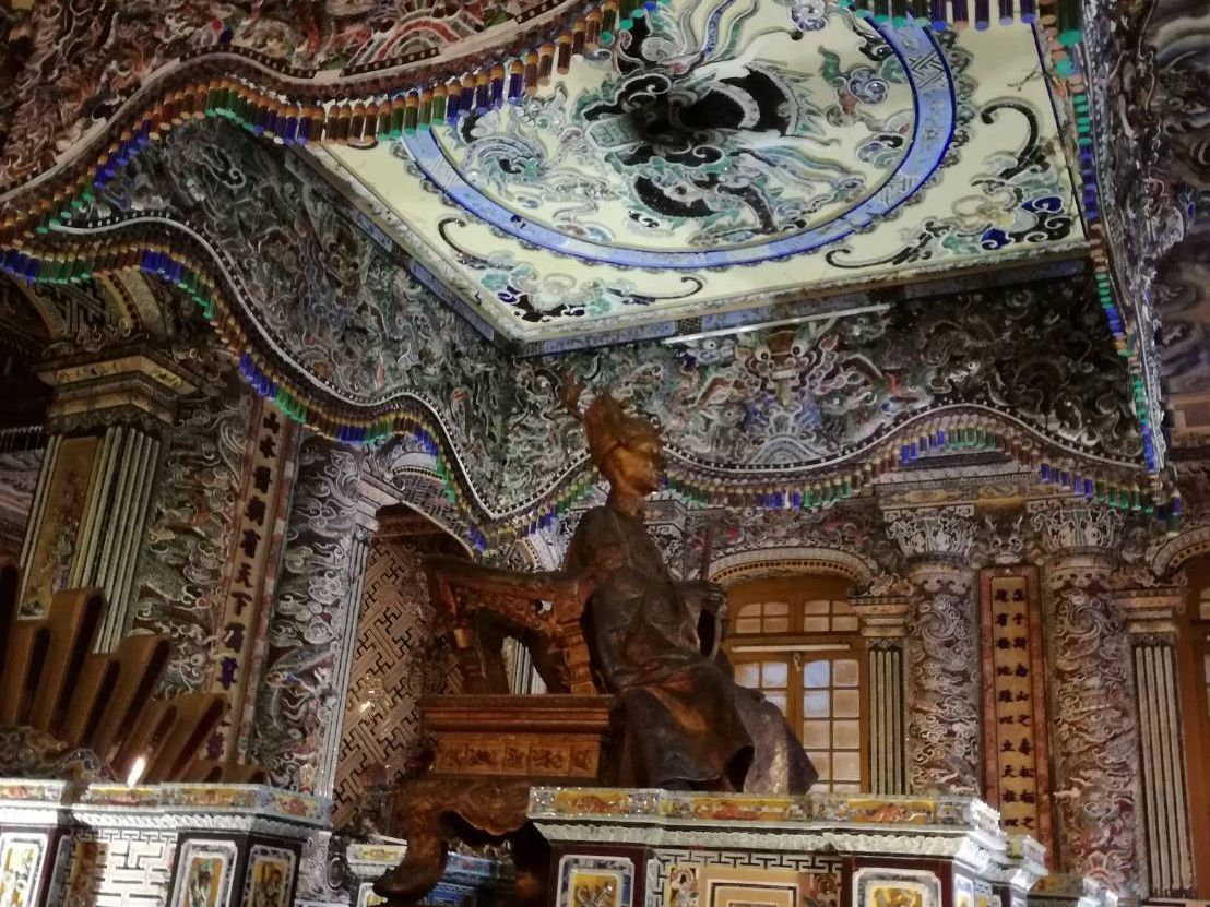 カイディン帝廟の石像の写真を見て以来ずっと気になっていたので、本物を目の前にして感動で震えました。そして帝廟内の装飾が予想をはるかに上回る豪華さで目を見張るばかり。玉座の下にはグエン朝最後の皇帝が永眠されていると聞き驚きでした。日本の陶器やら当時思いつく限りの贅を尽くしたこの建物が廟と思うとグエン王朝の栄華が想像できます。