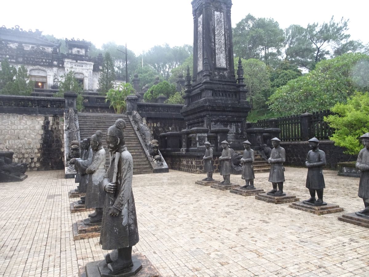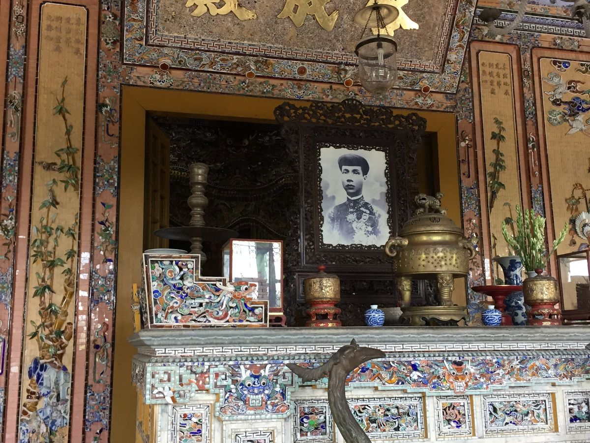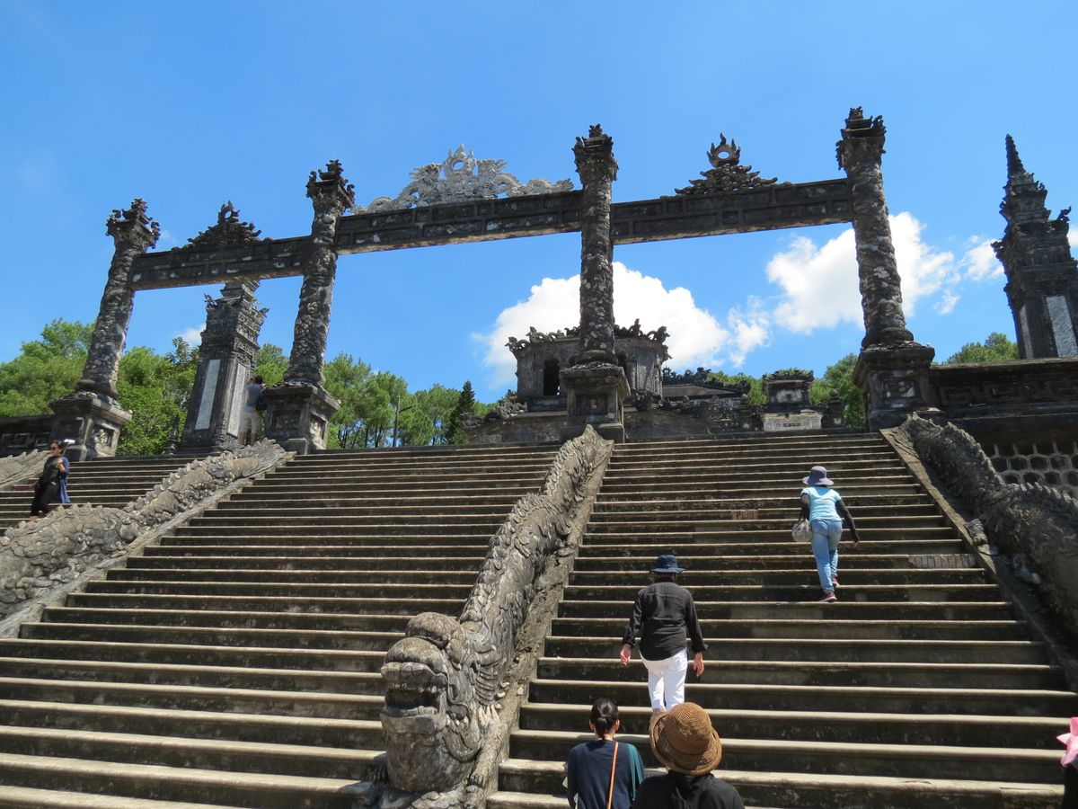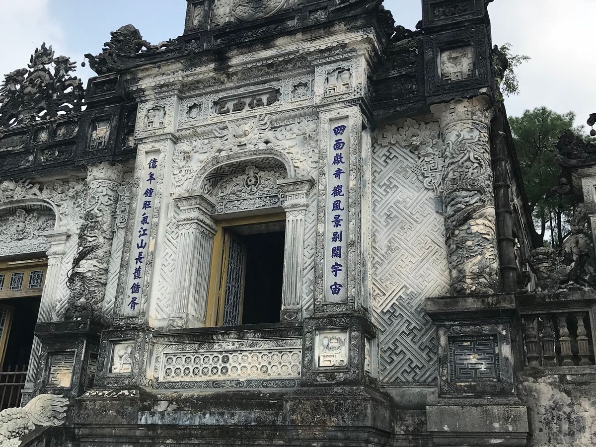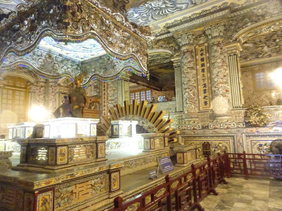 カイディン帝廟の石像の写真を見て以来ずっと気になっていたので、本物を目の前にして感動で震えました。そして帝廟内の装飾が予想をはるかに上回る豪華さで目を見張るばかり。玉座の下にはグエン朝最後の皇帝が永眠されていると聞き驚きでした。日本の陶器やら当時思いつく限りの贅を尽くしたこの建物が廟と思うとグエン王朝の栄華が想像できます。