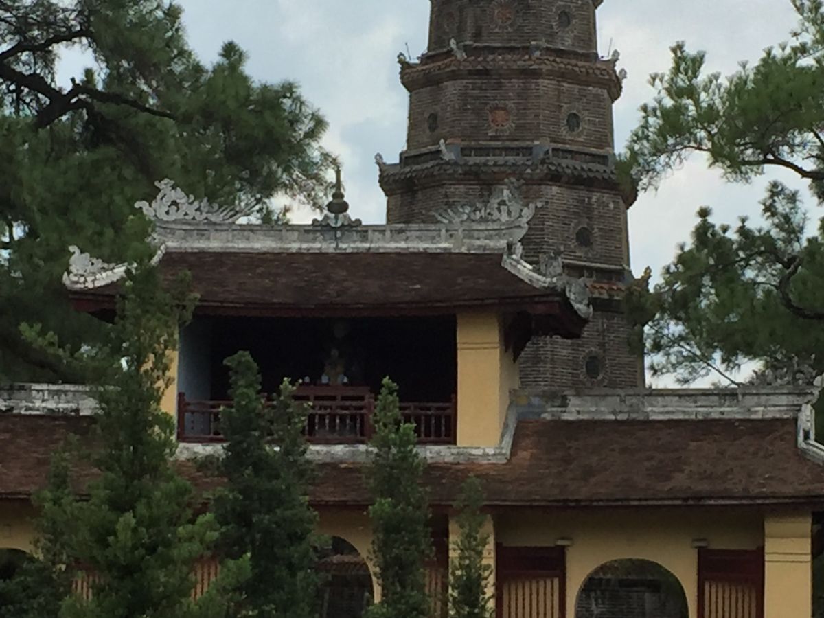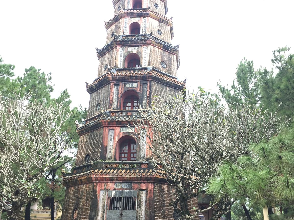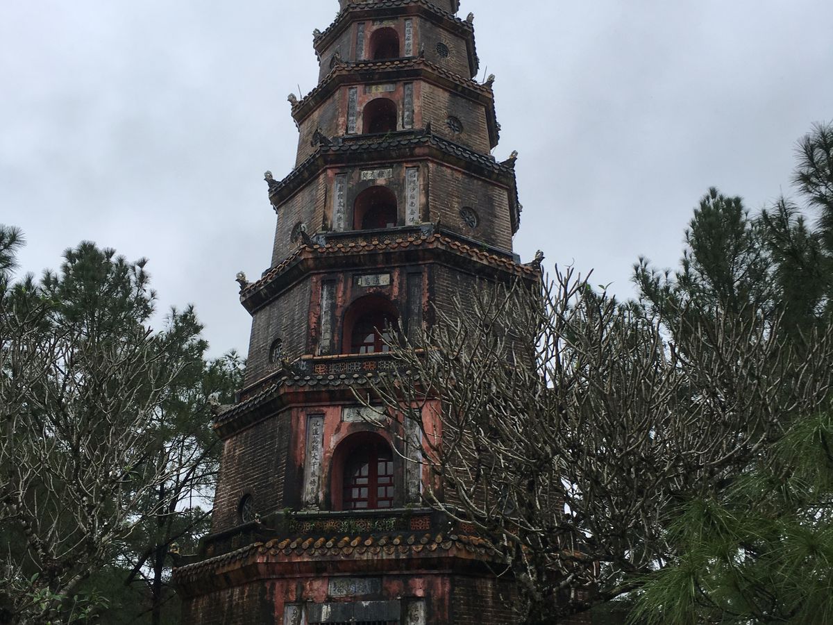 フエでは、ガイドさんが天気の状況に合わせ見学先を組んでくれました。カイディン帝廟は、石造りの彫刻や、きらびやかなモザイクの廟など様々な雰囲気を持つ史跡でした。天女寺は、建物に趣があり、心安まる寺院でした。
