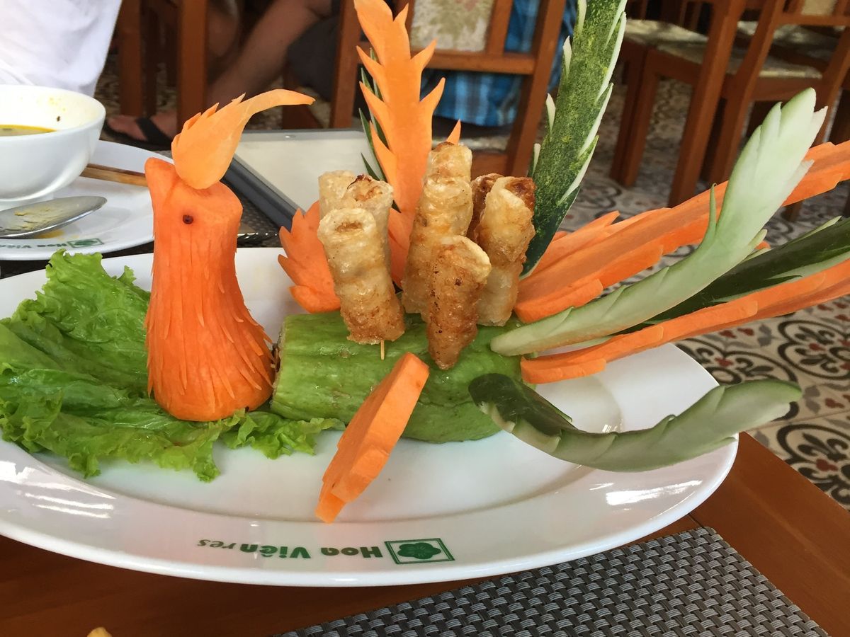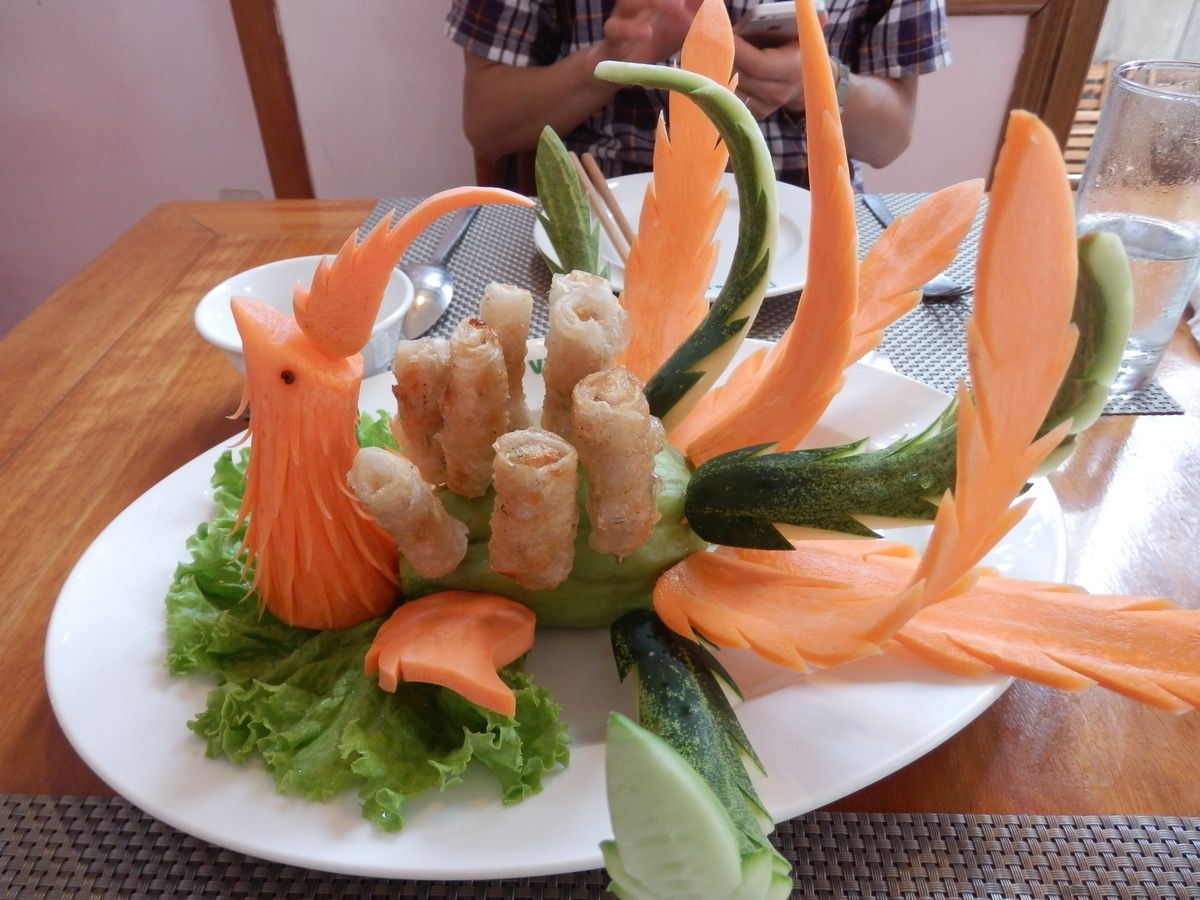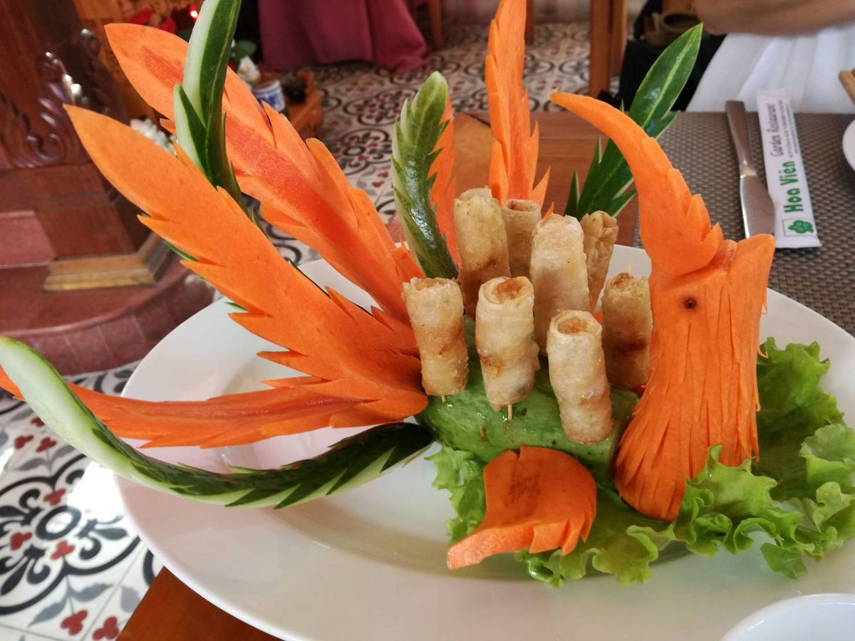 昼食は、市内の清潔なレストランで、出される宮廷料理には飾り包丁をした野菜が添えられており、美味しくいただきました。