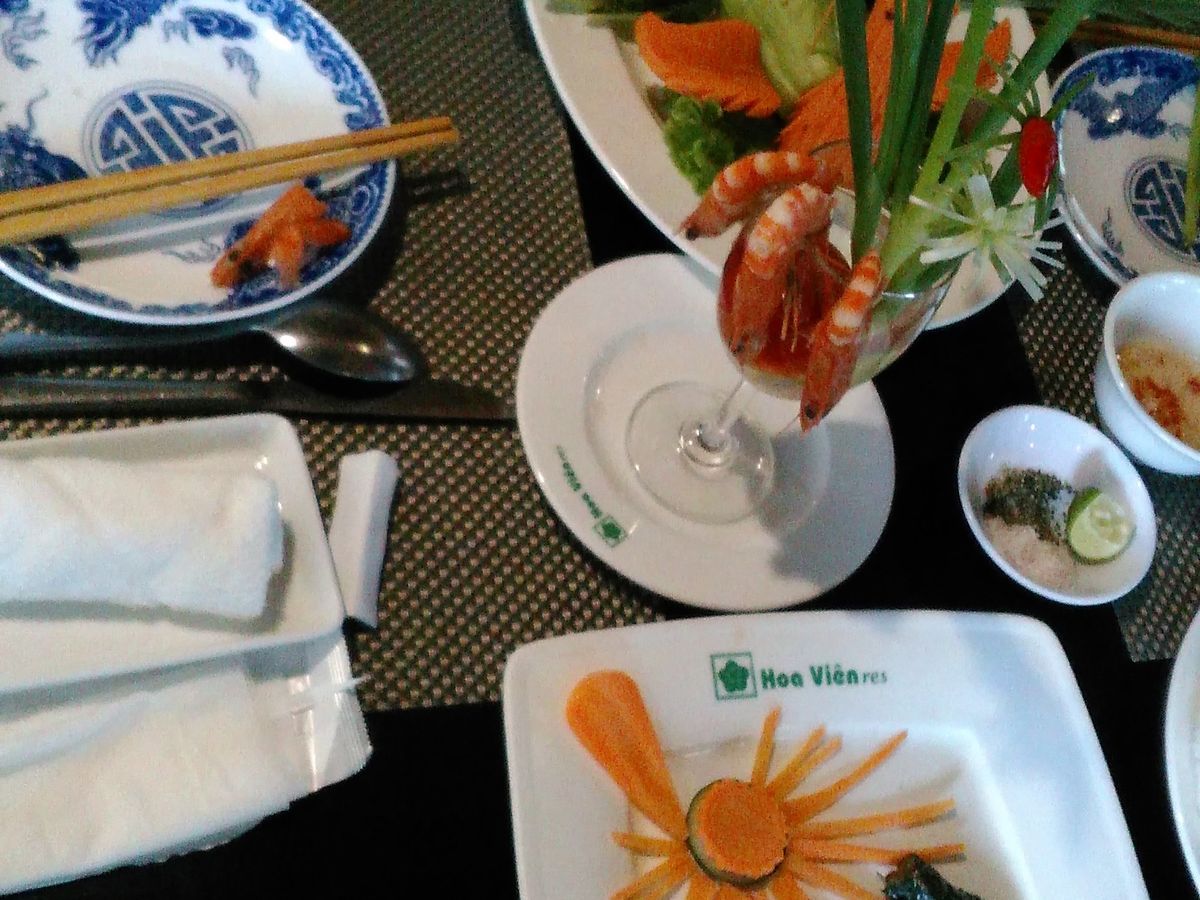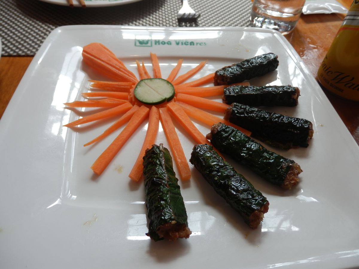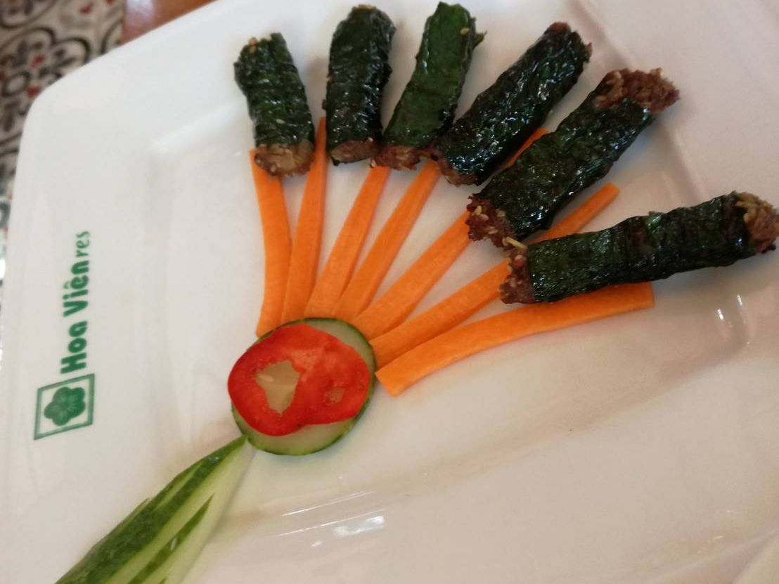 昼食もコース料理でブン、揚げ春巻き、牛肉の香草巻き、えび等名物料理が食べられました。味も美味しく見た目も面白くとても満足しました。お腹もいっぱいになりました。飲み物は少し高めでしたがフレッシュジュース等種類も多く良かったです。ちなみに私はパッションフルーツのフレッシュジュースを頂きましたが、ビールを飲みたくなるような料理でした!