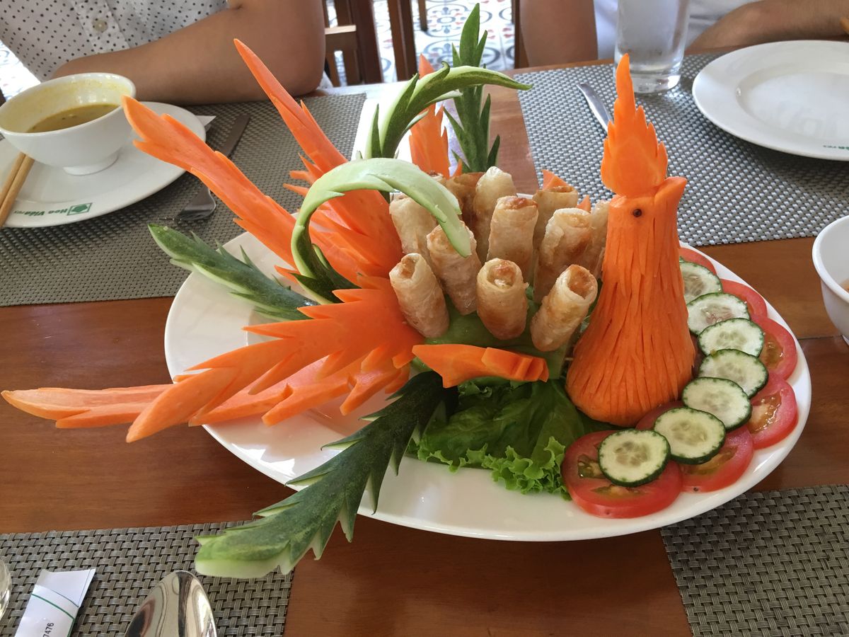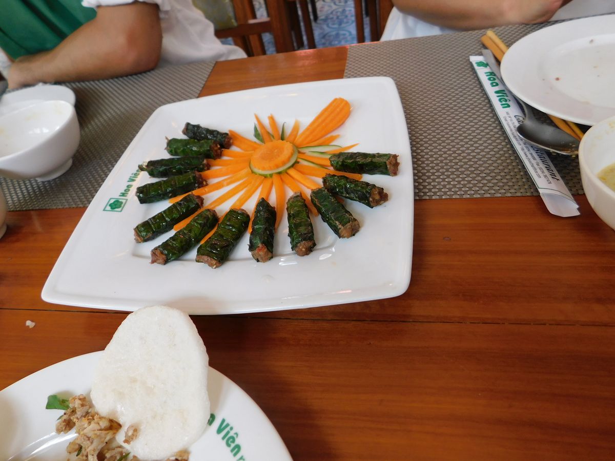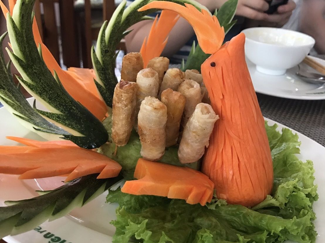 ランチのベトナム料理は、フエの宮廷料理とのことで、おいしいのはもちろんのこと、見た目がどれも可愛く目を引くものばかりで、次に出てくる料理が楽しみでした。ツアーの他の参加者たちとも、写真を撮るなどして楽しみながら食べることができました。写真は揚げ春巻きです。