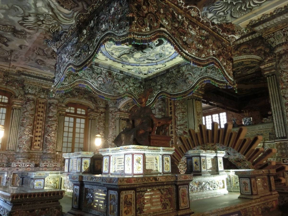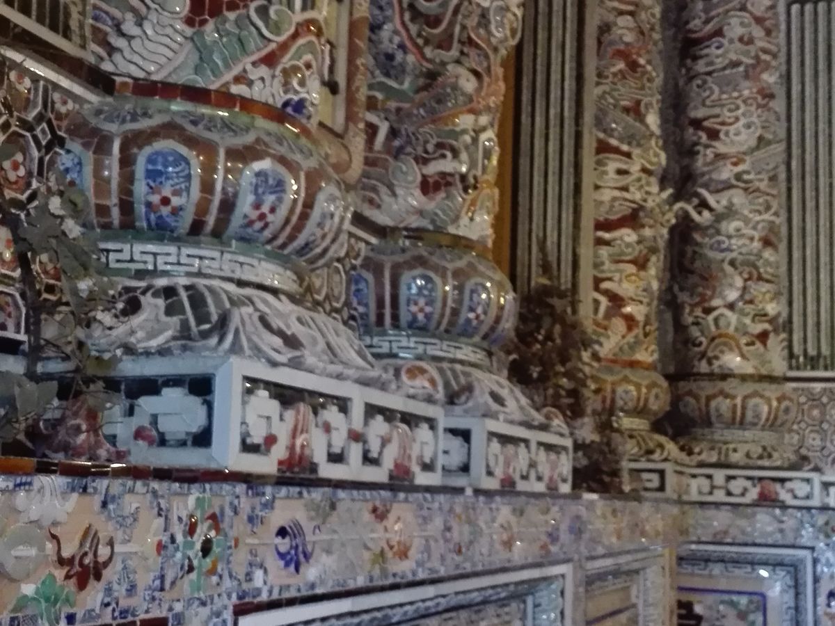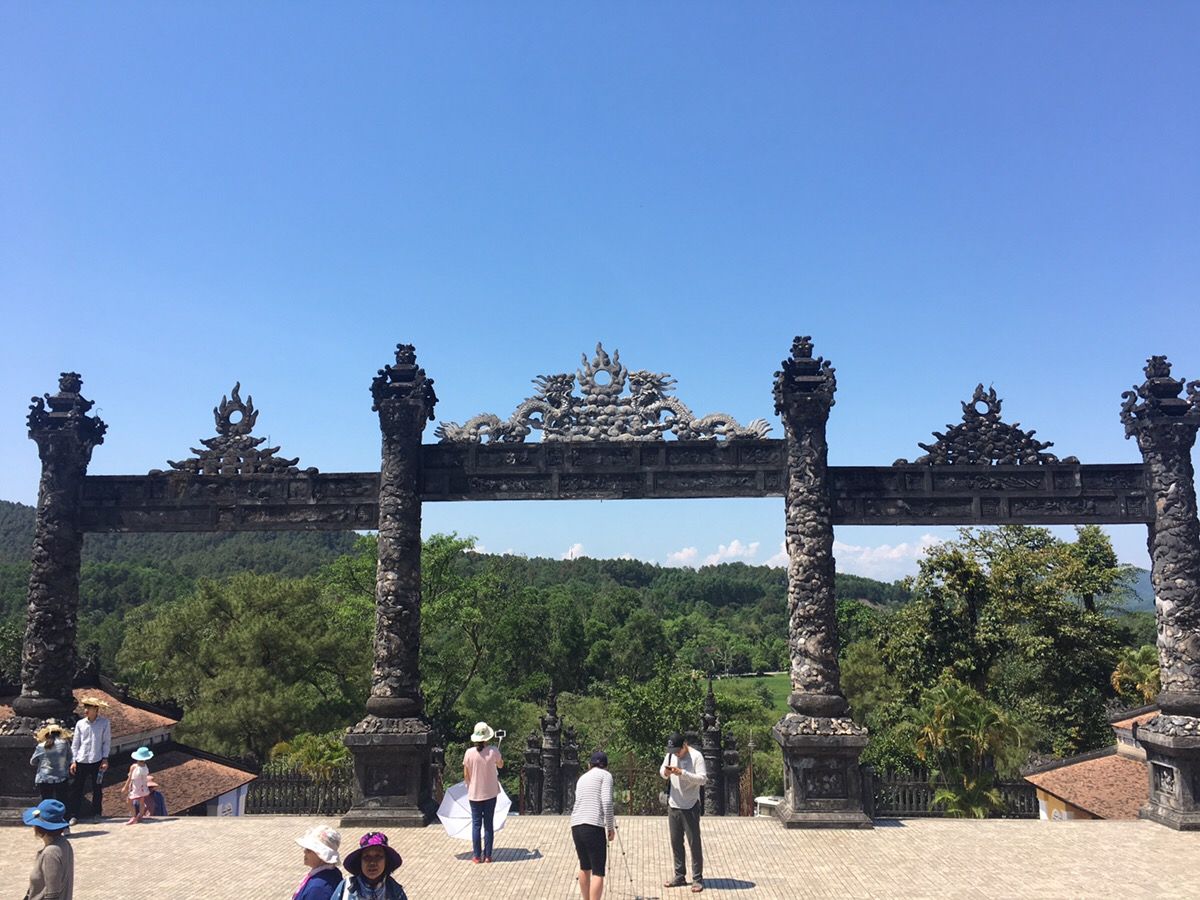 初のベトナム旅行、宿泊はダナンでしたが、世界遺産のフエには是非行ってみたいと思い、色々検索した中で一番リーズナブルだと感じたこのツアーを予約しました。フエまで約2時間、往路のバスではガイドさん(すみませんお名前を忘れてしまいました、、)がベトナムについて色々教えてくれたり、和ませてくれて、楽しいスタートとなりました。まず立ち寄ったのは12代皇帝カイディンのお墓。内部は壁から天井までガラスで装飾されており、ガイドさんによると日本のビール瓶のガラスもあるとのことで驚きました。