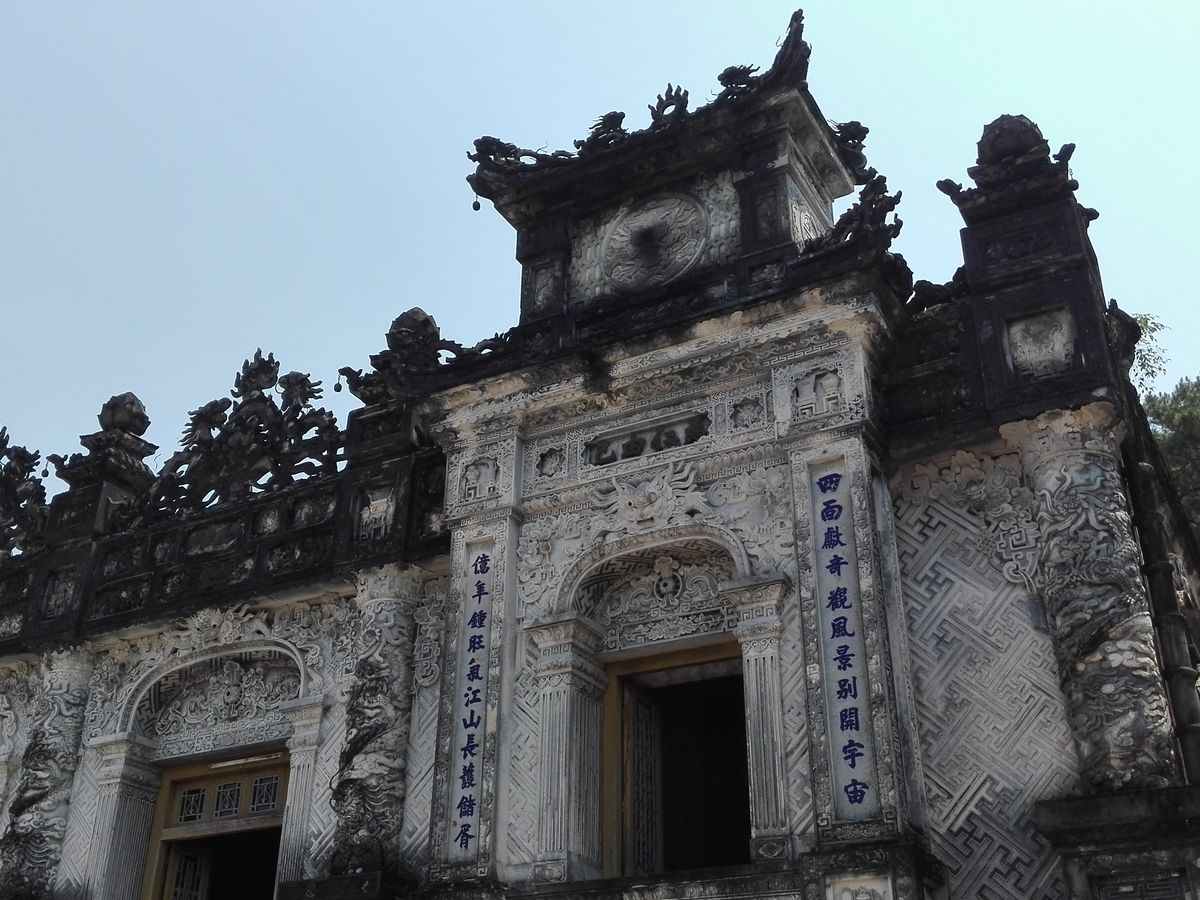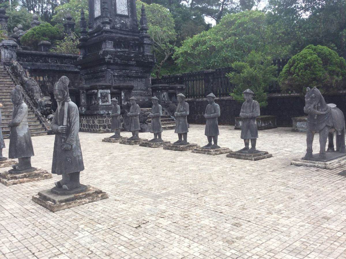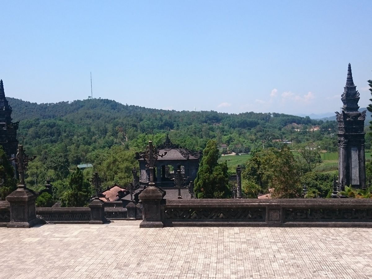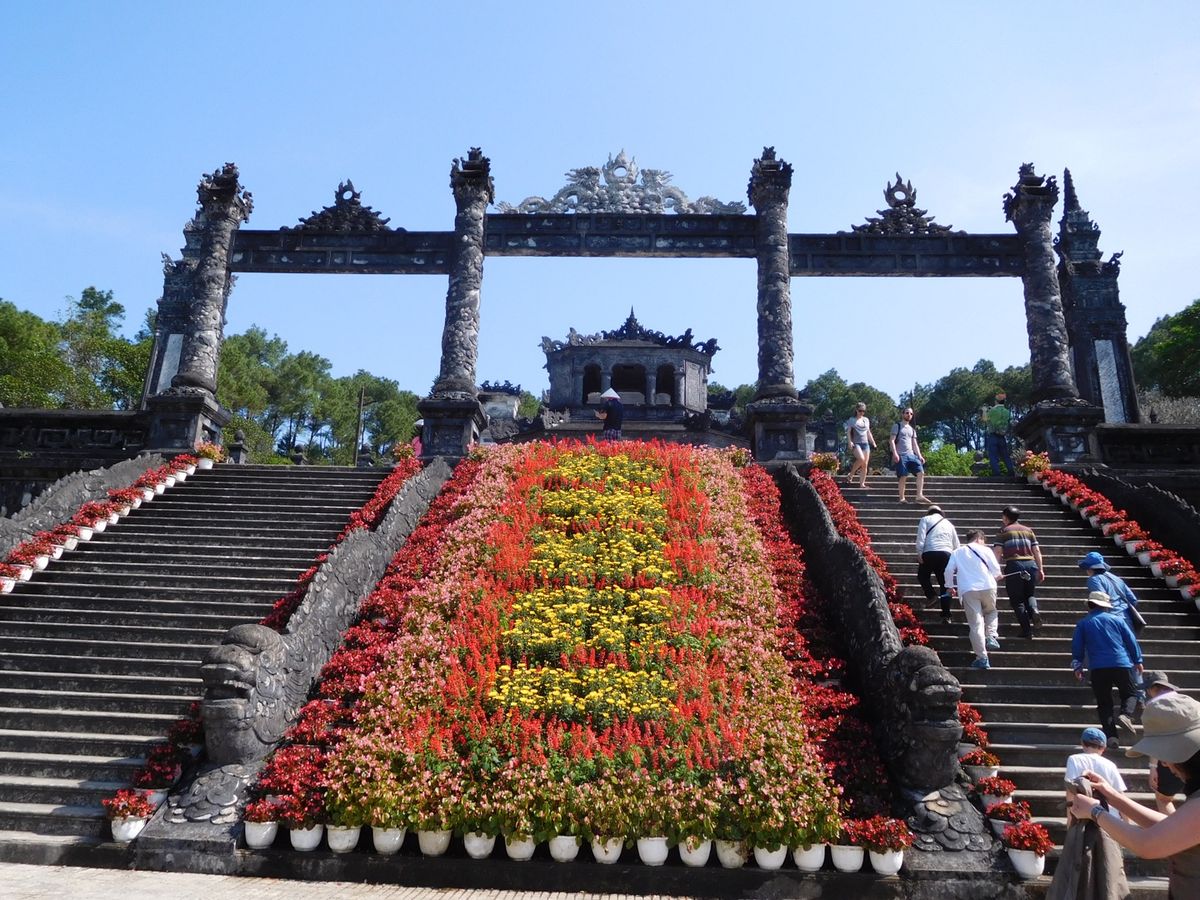 初のベトナム旅行、宿泊はダナンでしたが、世界遺産のフエには是非行ってみたいと思い、色々検索した中で一番リーズナブルだと感じたこのツアーを予約しました。フエまで約2時間、往路のバスではガイドさん(すみませんお名前を忘れてしまいました、、)がベトナムについて色々教えてくれたり、和ませてくれて、楽しいスタートとなりました。まず立ち寄ったのは12代皇帝カイディンのお墓。内部は壁から天井までガラスで装飾されており、ガイドさんによると日本のビール瓶のガラスもあるとのことで驚きました。