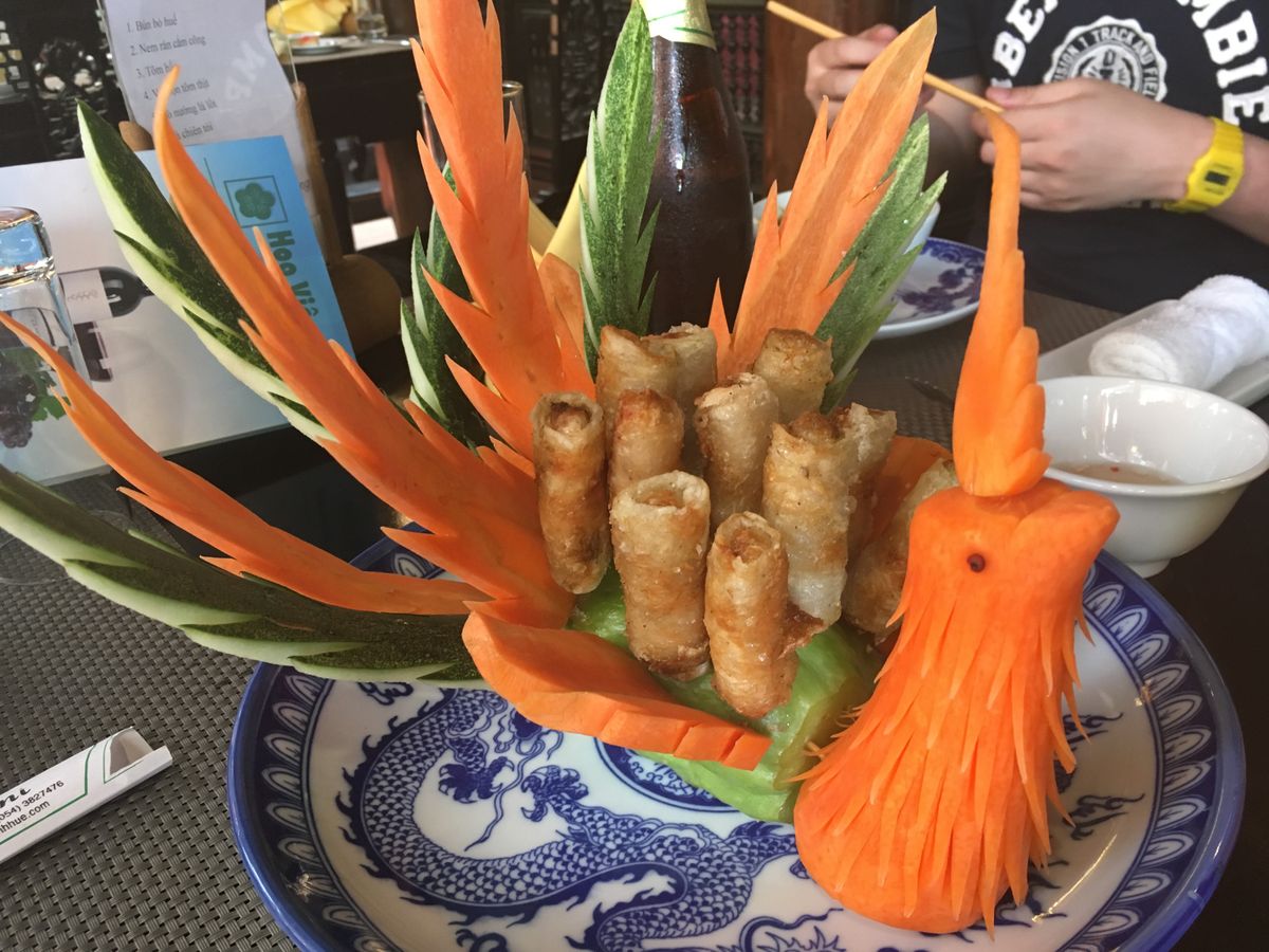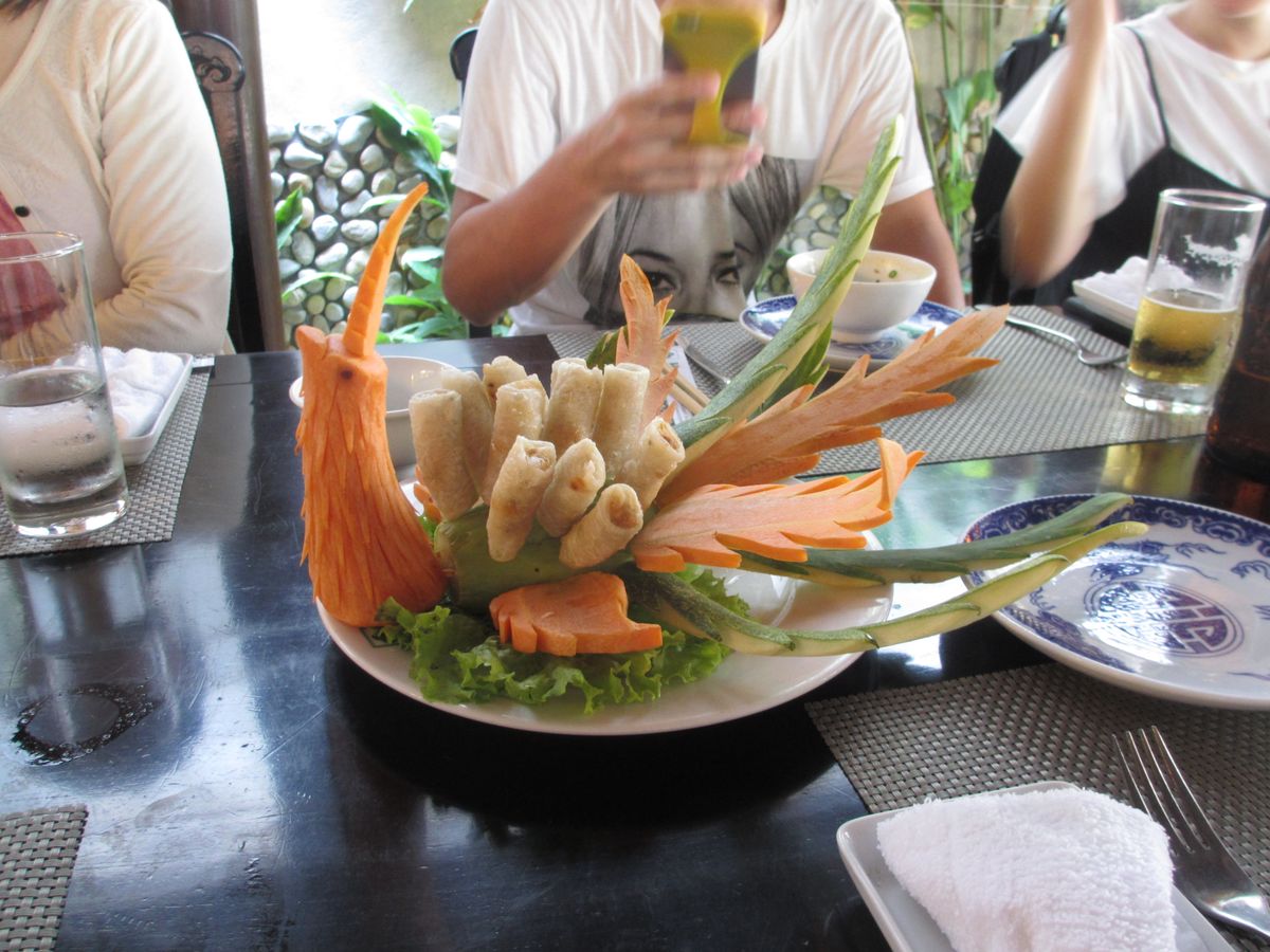 その後、ドラゴンボートに乗り、お寺観光をして、グエン朝の王宮へ。フエは日本の様に湿気があり暑くてかなりばてしまい、王宮では30分くらい自由時間をもらえましたが、暑さのあまり動け回れず。。王宮の前に昼食だとベストだったかなと思いました。宮廷料理の昼食は、ガイドブックに載っていた通り人参で作られた鳳凰(?)の飾りがついていたり、見た目で楽しめました。味も日本人の好みに合う料理だったと思います。冷房のきいたレストランを期待しましたが、オープンレストランでした。清潔感のある感じだったのはよかったです。昼食後はダナンに戻り、雑貨屋さんに立ち寄りましたが、私たちも含め、参加者の皆さんお買い物を楽しまれていました。初めに言われた自由時間を明らかにオーバーしてましたが、全員の買い物が終わるまで待ってくださったガイドさんの心配りに感謝でした。