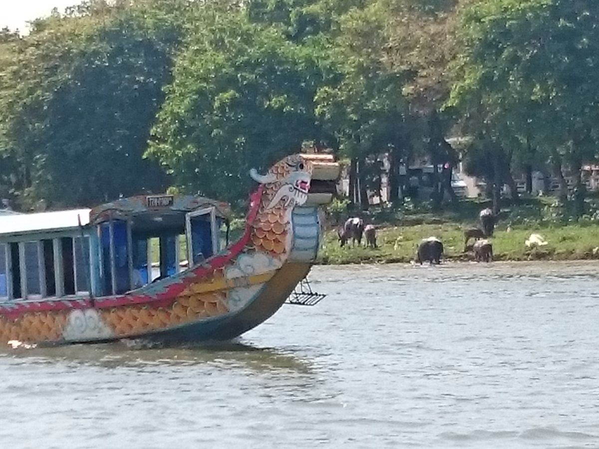 短い時間でしたが、水牛などを見ながらドラゴンボートに乗ってボーッとするのもよかったです。(物品の販売もありましたが、興味のあるものがなかったので購入はしませんでした。ごめんなさい。買わなくてもうるさくは言ってきませんでした。フエと刺繍の入ったコースターとかポーチがあったらいいなと思いました。)
