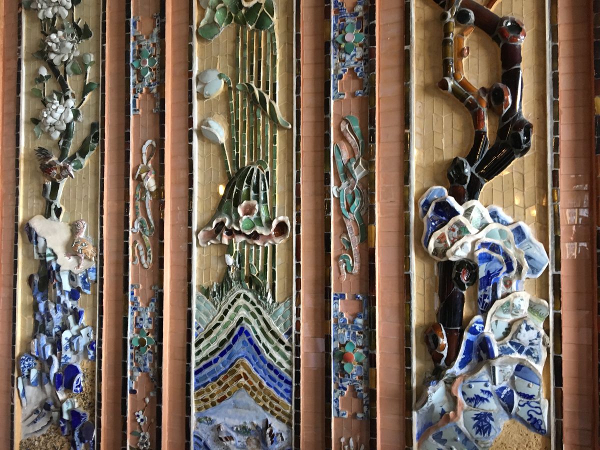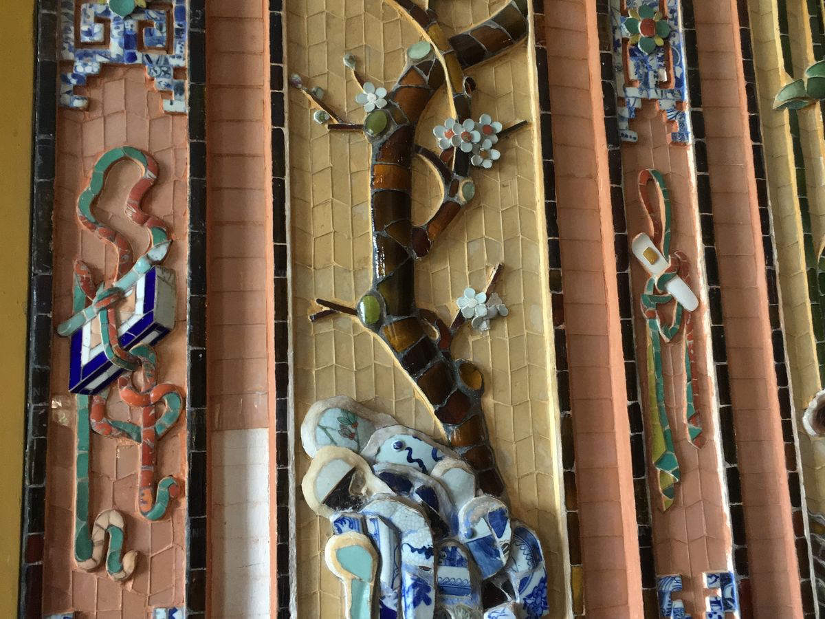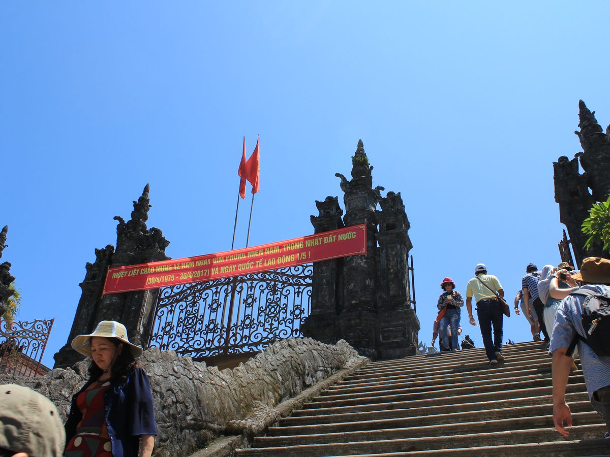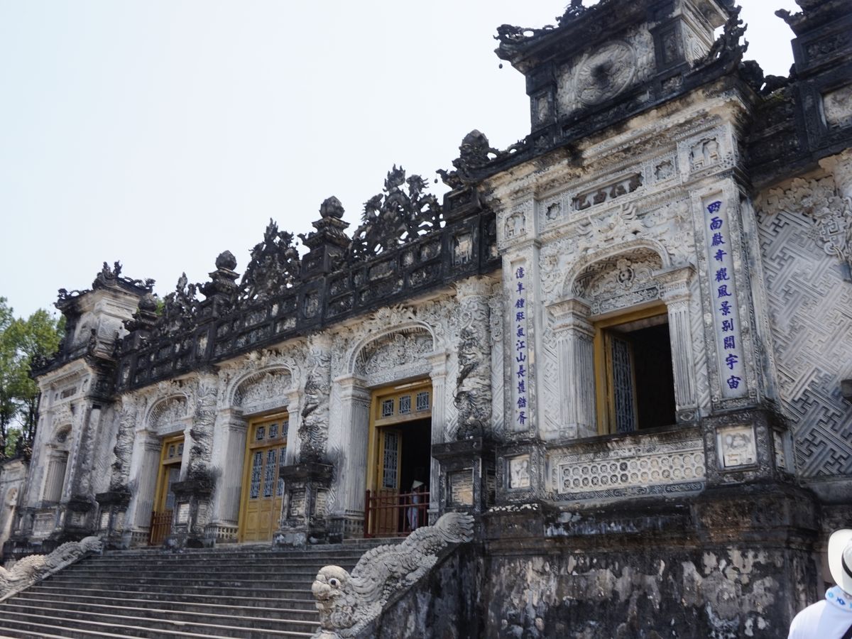 まず訪れたのはカイディン帝陵です。こちらの内部装飾のモザイクに日本のビール瓶が使われているとのガイドさんの説明を聞かなければわかりませんでした。2月にバルセロナのガウディ建築にもあったモザイクを思い出し、西洋と東洋の繋がりを感じるとともに、ガウディもタイルやガラスなどをリサイクルしてモザイク作成していたことは偶然ではないと思いました。